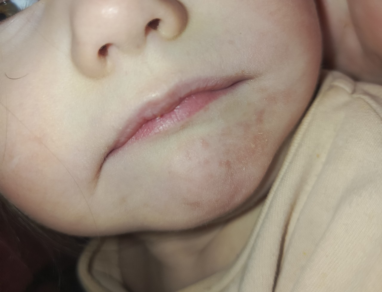 Высыпания на лице и руке Ребенку 3 года. На лице появилось вот такое красное пятно...