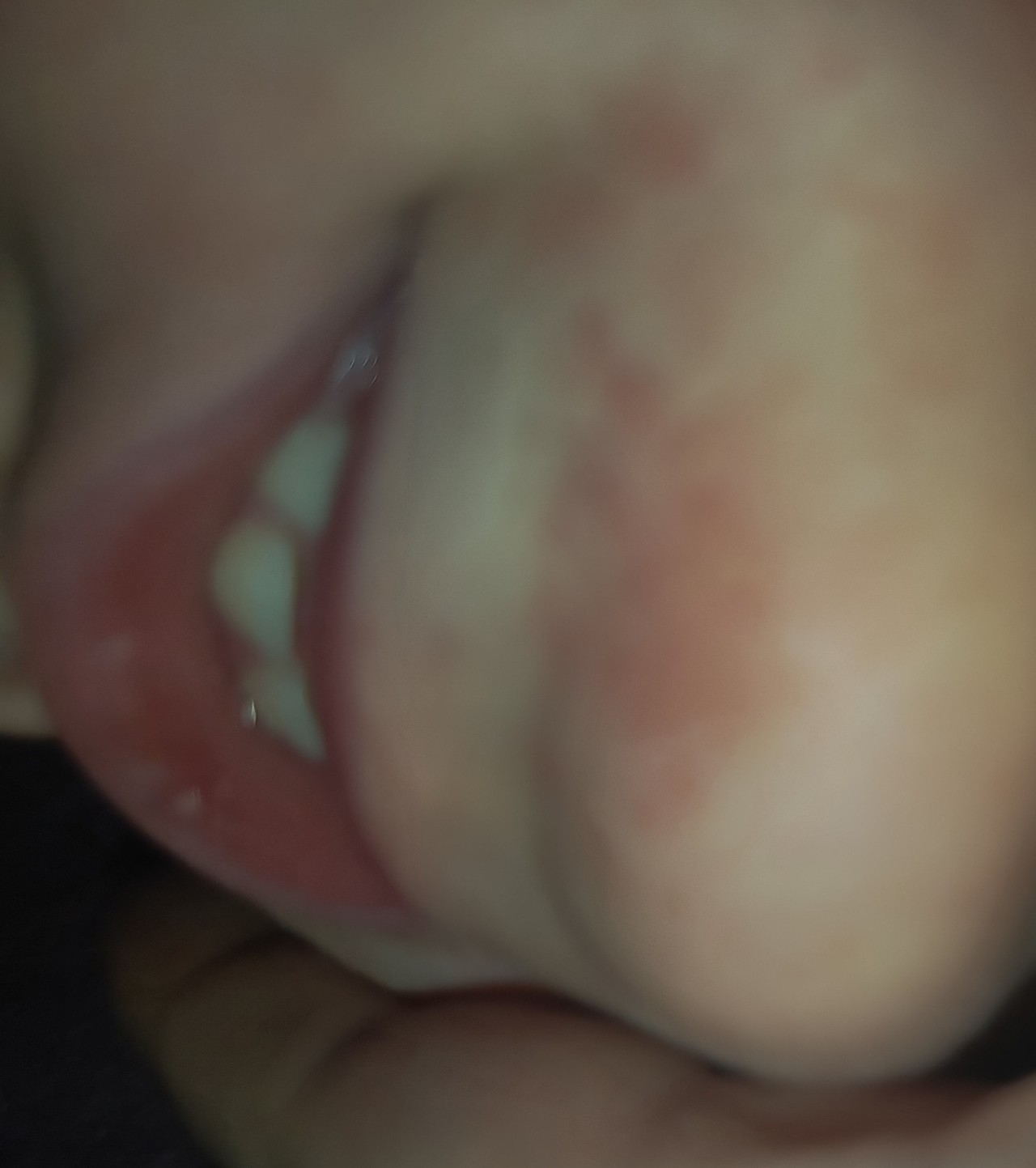 Здравствуйте, у моего ребёнка появилось вначале небольшое высыпание пару прыщиков на бороде где-то месяц назад. Теперь эти прыщи сливаются в одно пятно. На фото где расплывчато видно цвет потому что на других фото не видно красноты. Это похоже на аллергию или на другое что. Ничего больше не беспокоит зуда нет, переодичечки щёки красные. Даю антигистаминное и ничего не меняется только хуже. Записались к врачу ждём приёма.