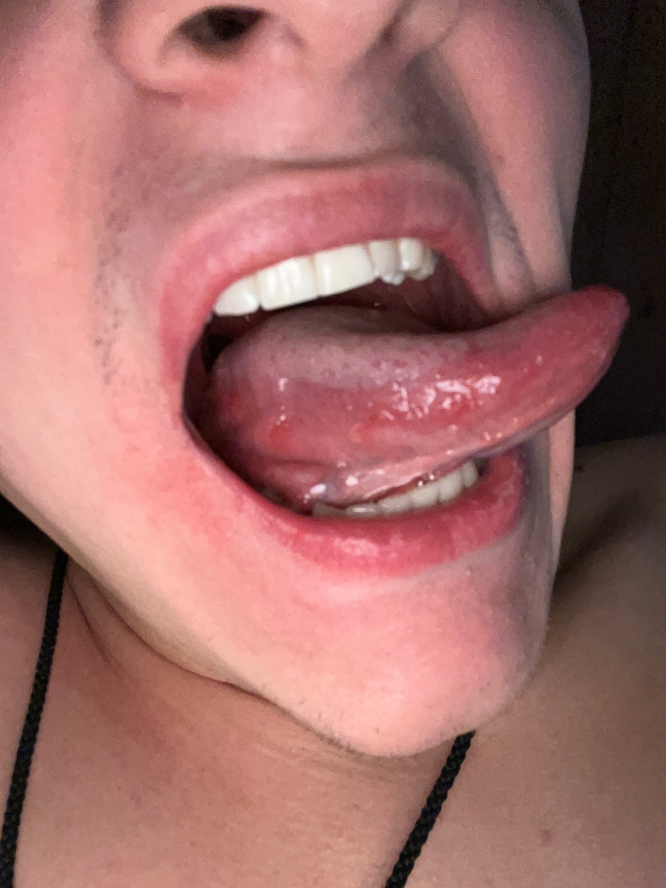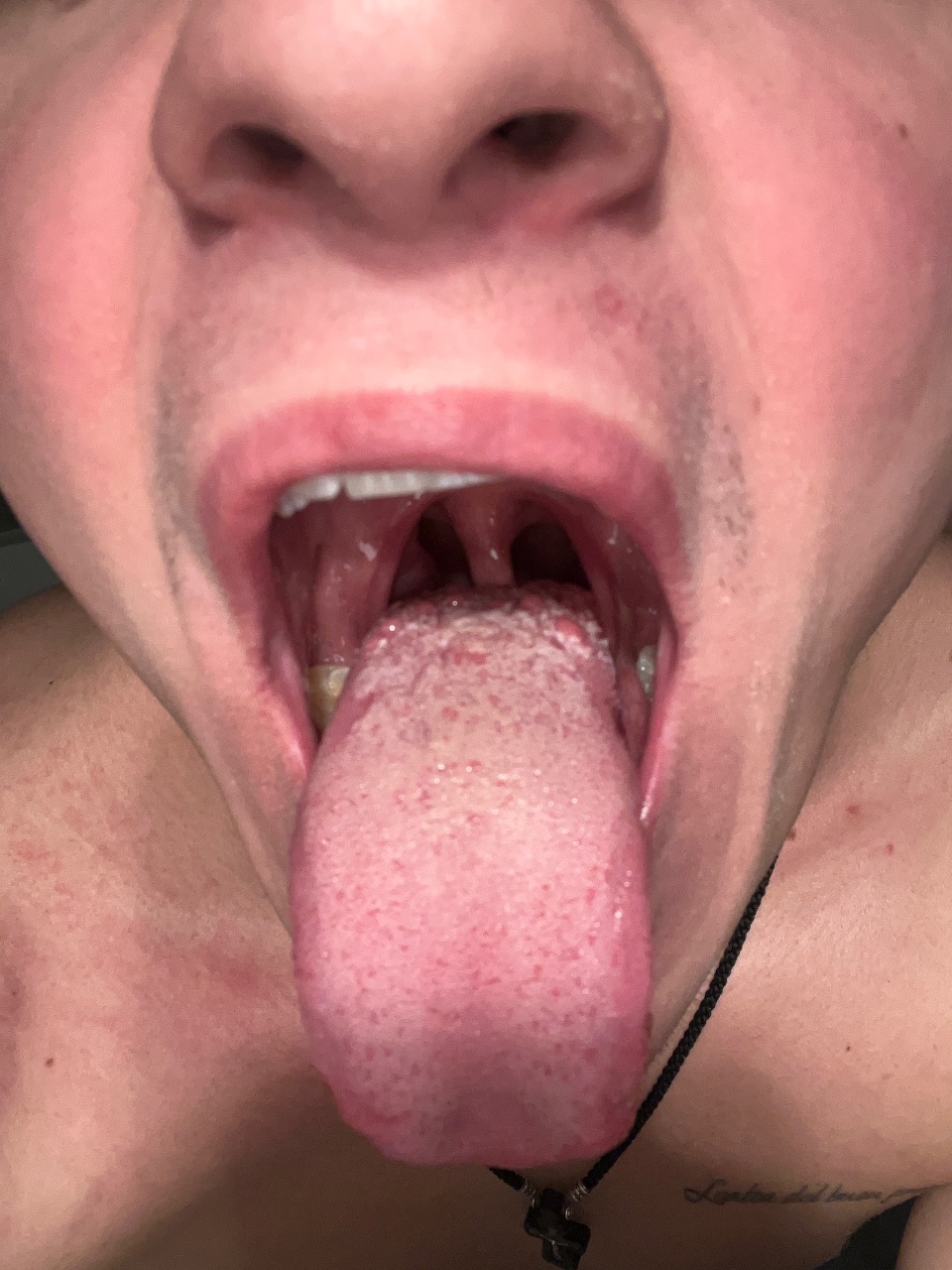 Камера к сожалению не передает но на языке ближе к гландам есть небольшие как будто язвочки с белой окантовкой что ли и красной серединой (будто кожа слазит) но их на этом фото нет они по бокам языка это фото я сделал по поводу белого налета