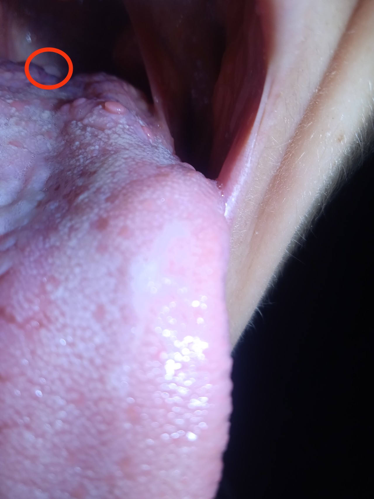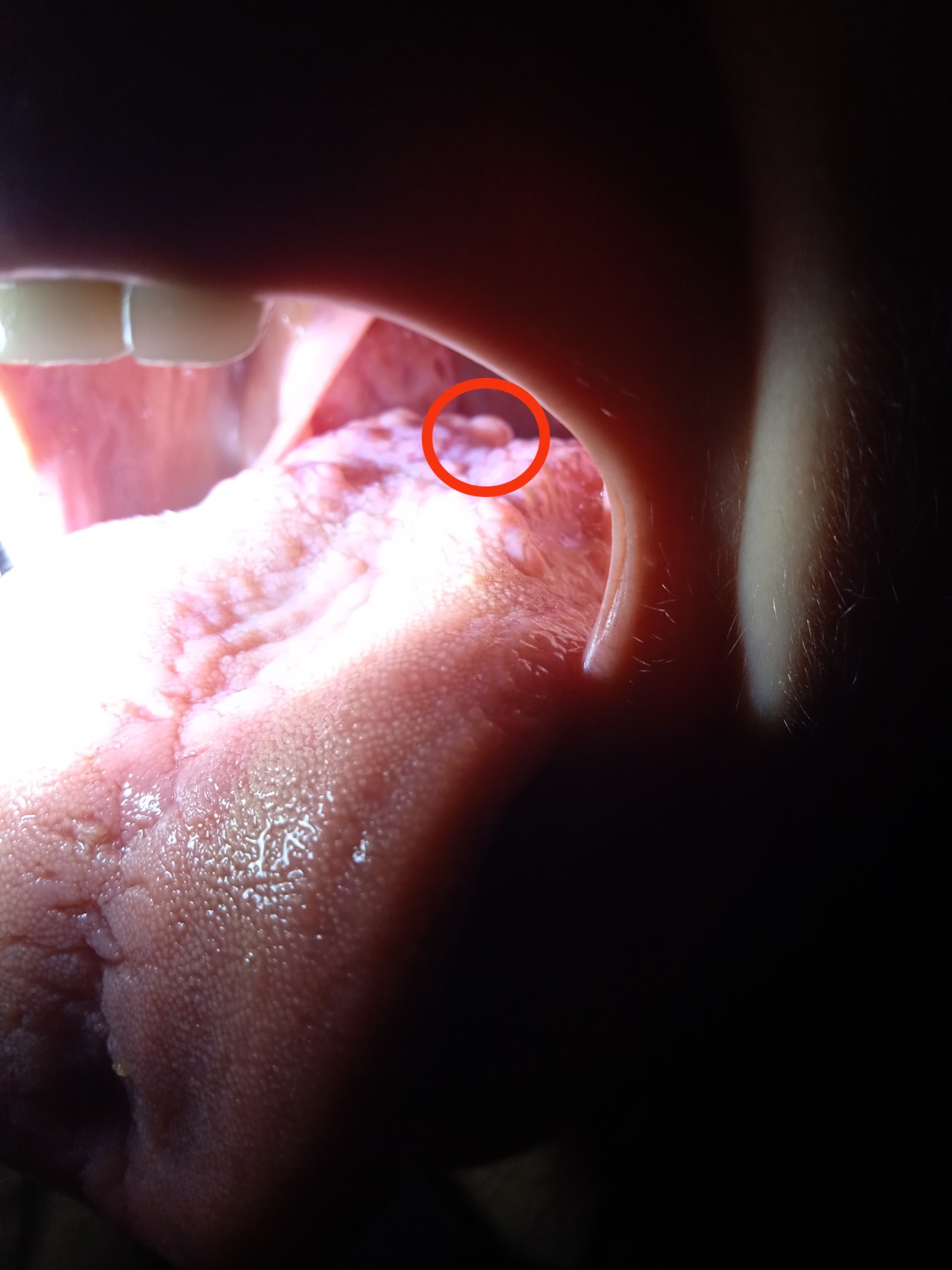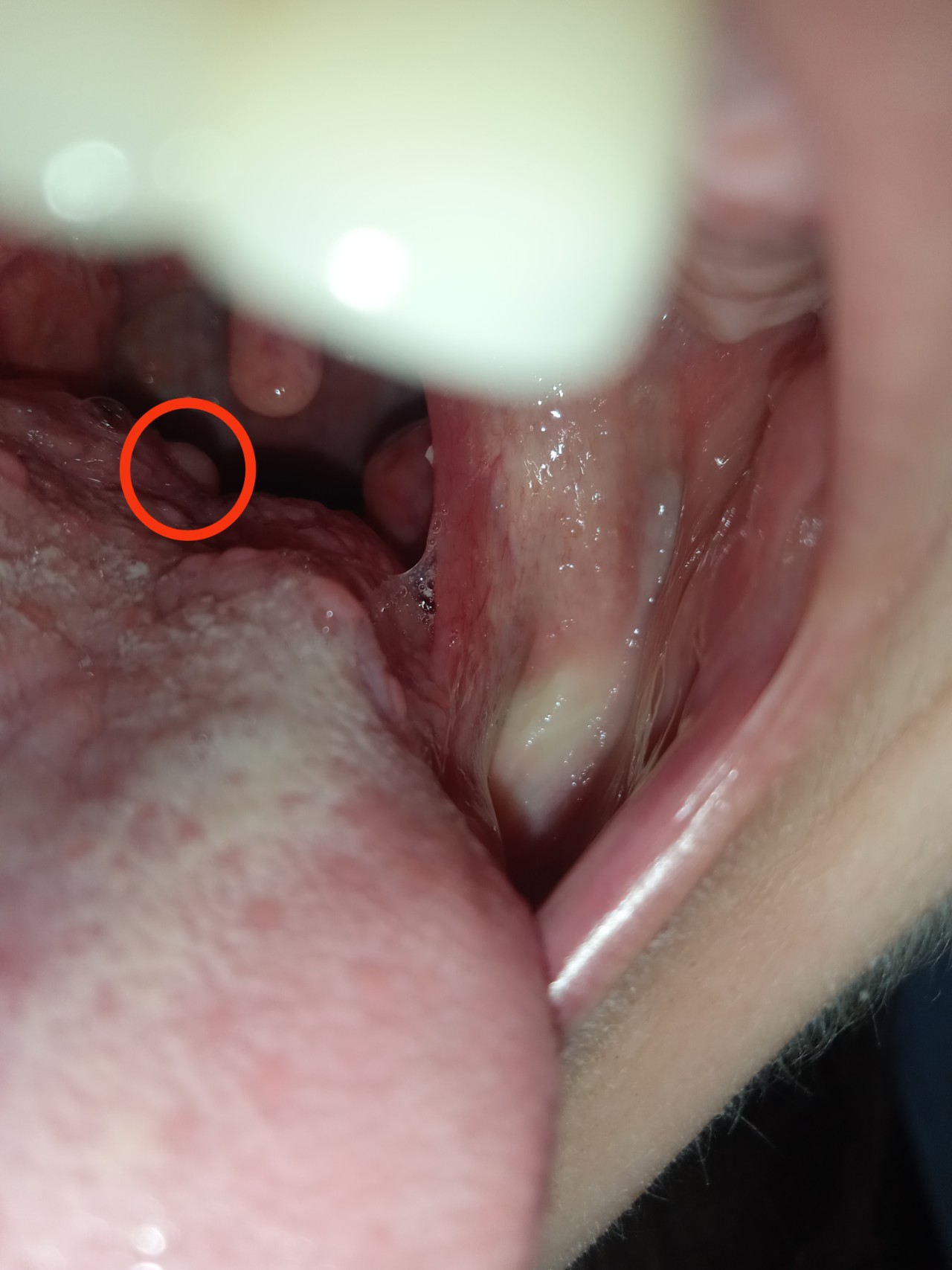 В вівторок випадково знайшла утворення на корені язика. Роздивитися і взагалі помітити його важко. На фото обвела червоним кільцем. В середу вже було важче говорити.