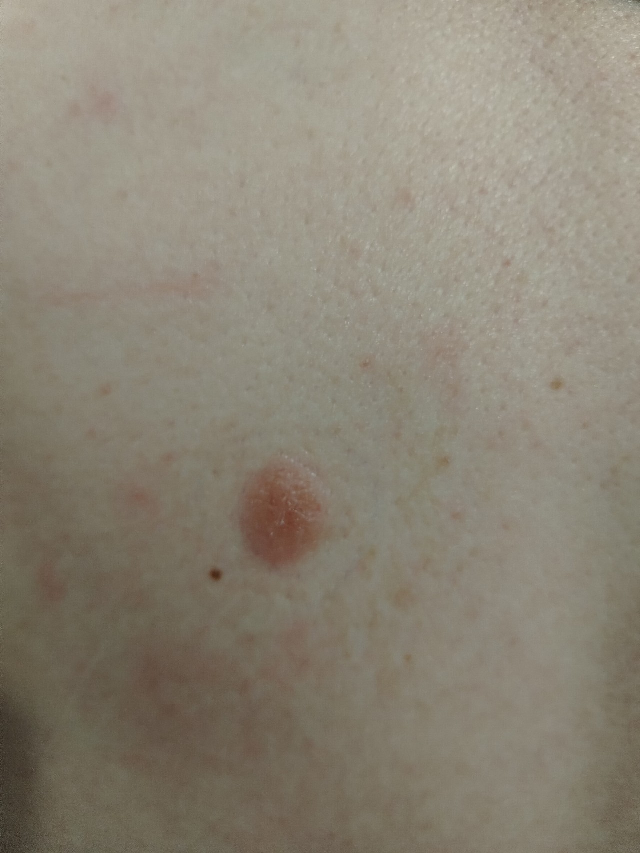 Высыпания на теле Вылезло еле видное светлое кругловатое пятно на правом плече. Через...