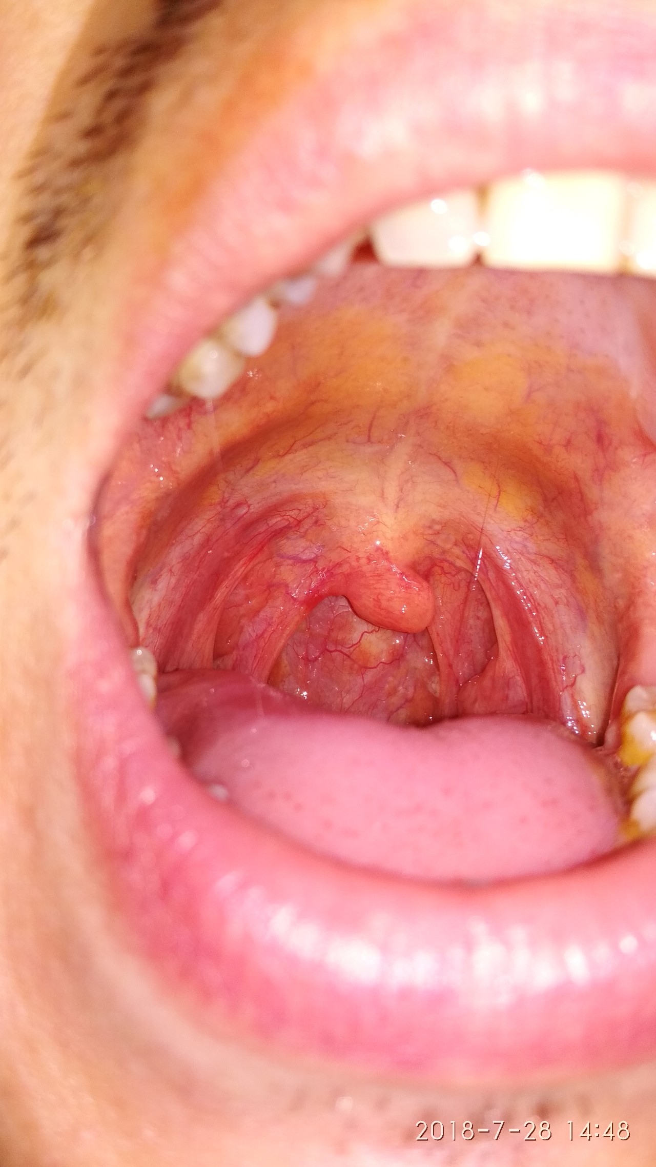 Чувство инородного тела в области правой миндалины, бледная слизистая