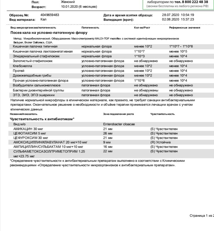 Добрый день, Елена Борисовна! Снова хотим к вам обратиться. После нашего с вами общения несколько дней давали ребёнку лактазу, затем пошли к очередному врачу, она сказала убрать лактазу, назначила креон, смекту и анализы. Пришли анализы, кровь, как сказали хорошая, моча тоже, а копрограмма ужасная, лейкоциты 50-40. Назначили нам антибиотик зиннат, исходя из нашего анализа на патогенную флору, в которой выявлен enterobacter cloacae. Сказали что у нас вяло текущая кишечная инфекция. Пьём антибиотик 4ый день, стул все также водой и стал чаще. Прожилки крови появляются теперь каждый раз, единственное запах неприятный от кала ушёл. В весе за 2 недели потеряли 200 грамм. Посмотрите, пожалуйста ответы анализов, что можете сказать, разве может так протекать кишечная инфекция, если анализ крови нормальный. И чтобы вы нам посоветовали? Спасибо Вам большое.