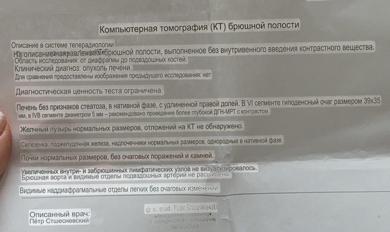 Здравствуйте, совершено случайно на узи обнаружено образование! В секции печени слегка гипоэхогенное, гетерогенное образование размером 44 х 38 х 39 мм с несколько усиленным периферическим сосудистым кровотоком — ФНГ? необходима дальнейшая диагностика КТ/МРТ. Кроме того, печень без очаговых поражений, не увеличена, длиной 136 мм по правой среднеключичной линии. Желчные протоки не расширены. Видимая поджелудочная железа (головка, тело) нормоэхогенна и не увеличена. Периаортальное пространство чистое. Брюшная аорта не расширена. Почки симметричные, с сохраненной эхоструктурой, без признаков задержки мочи Длина правой почки составила 105 мм, левой - 111 мм. Стенки мочевого пузыря гладкие. Свободной жидкости в брюшной полости не обнаружено. В остальном органы брюшной полости без признаков патологии. Область исследования: от диафрагмы до подвздошных костей. КТ Печень без признаков стеатоза, в нативной фазе, с удлиненной правой долей. В VI сегменте гиподенсный очаг размером 39х35 мм, в IVB сегменте диаметром 5 мм - рекомендовано проведение глубокой ДГН-МРТ с контрастом. Желчный пузырь нормальных размеров, отложений на КТ не обнаружено Селезенка, поджелудочная железа, надпочечники нормальных размеров, однородные в нативной фазе. Почки нормальных размеров, без очаговых поражений и камней. Увеличенных внутри- и забрюшинных лимфатических узлов не визуализировалось. Брюшная аорта и видимые отделы артерии не расширены. Видимые наддиафрагмальные отделы легких без очаговых изменений. Делала без контраста, потому что астма и аллергия. Что меня волнует! Через пару дней после кт начались боли в позвоночнике! У меня есть протрузии, кривошея и остеохондроз. Но такие боли впервые, как будто что то лежит на спине как камень. Временами отпускает. Временами стучит сердце очень 115. Временами то сзади под лопаткой потянет, то колет, было даже что раз рука онемела. Что мне делать? К онкологу через 5 дней только! Это рак? Метастазы за неделю пошли? Кт без контраста и могли не увидеть?