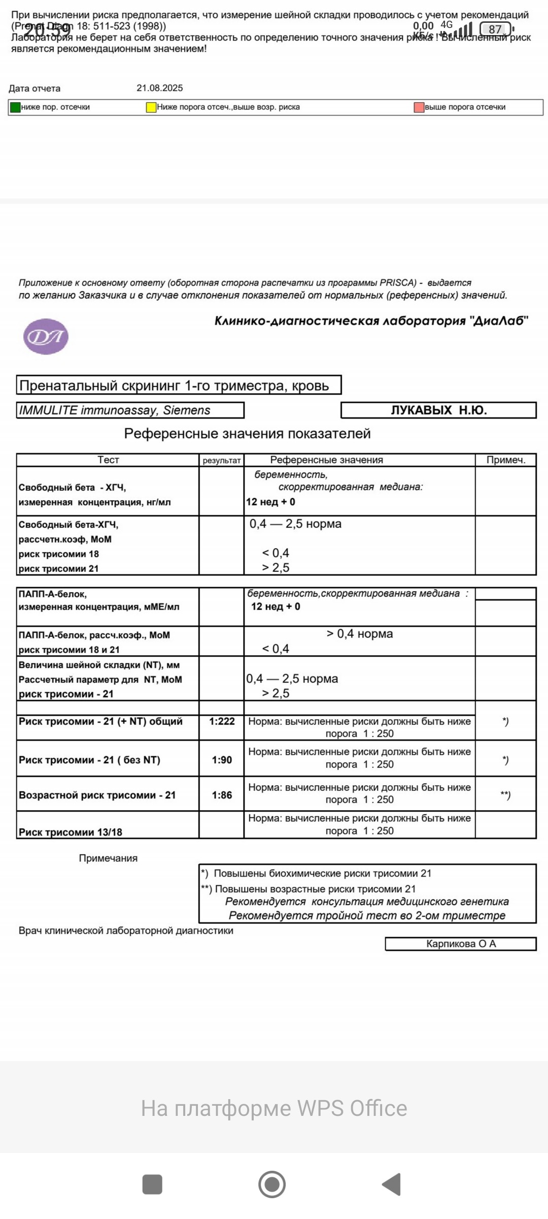 Скрининг 1 триместра хочу узнать все ли хорошо с анализами Расшифруйте пожалуйста...
