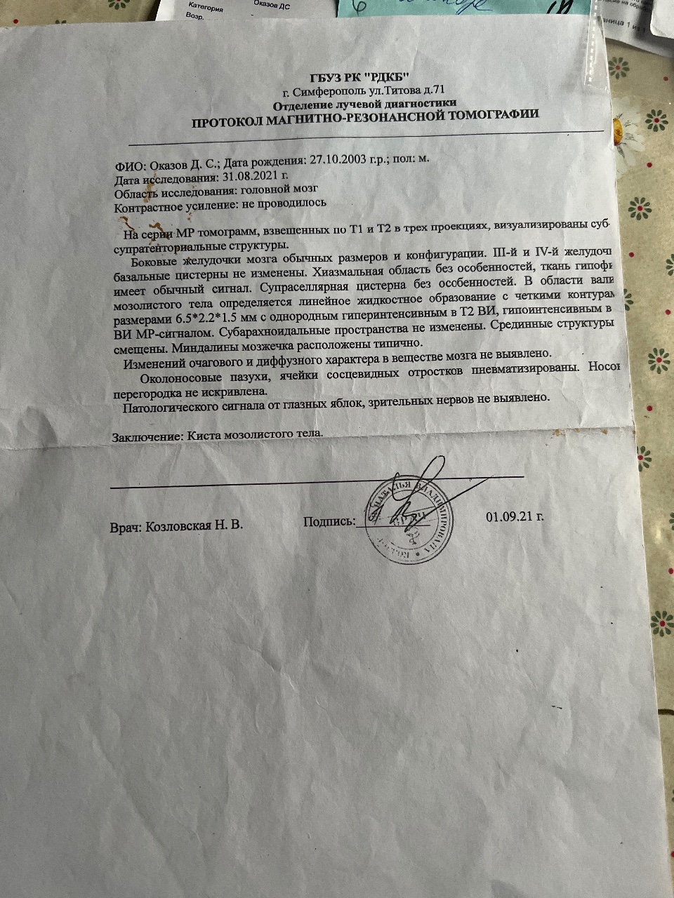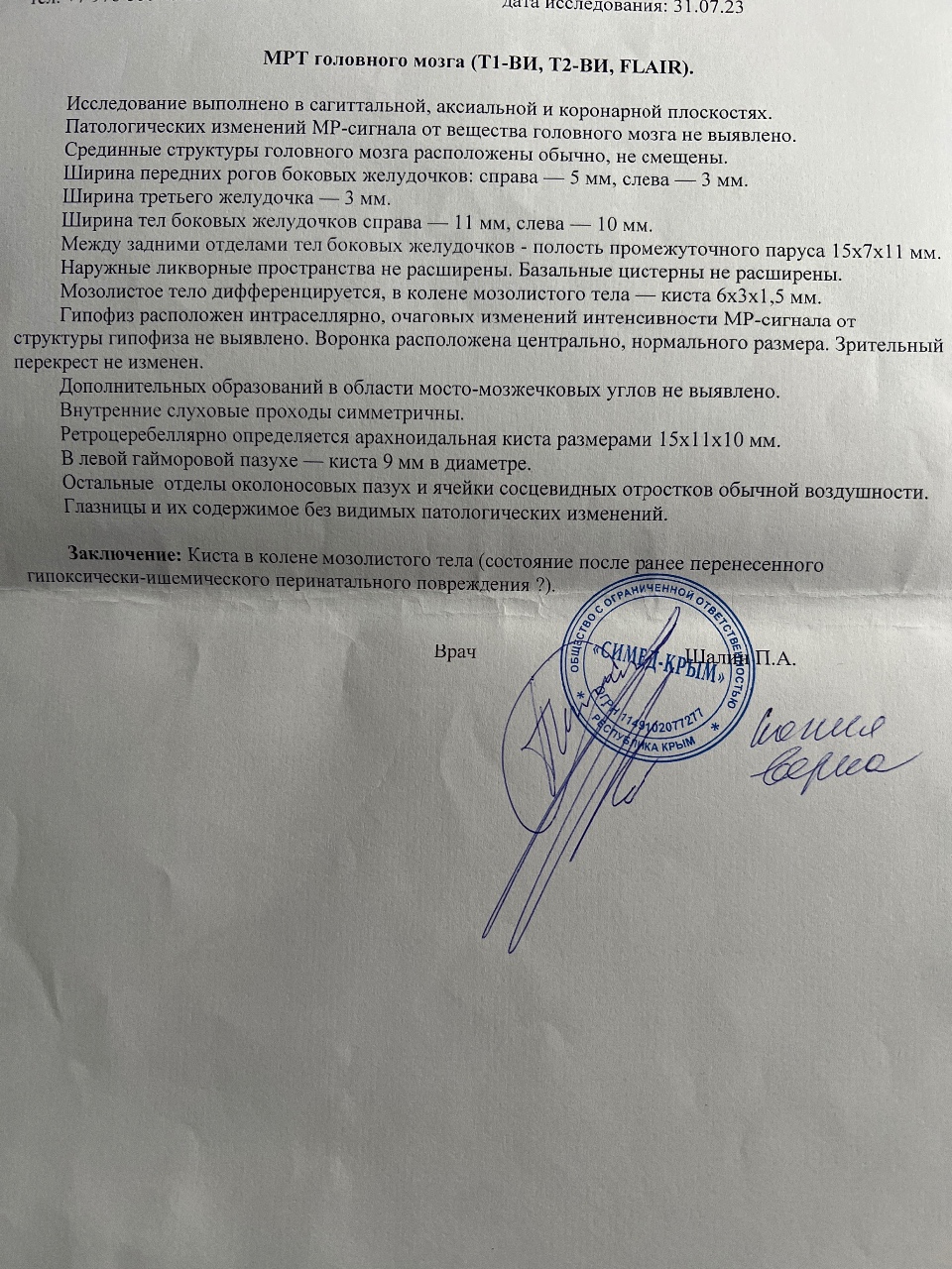 Результаты МРТ (ставят дигноз киста?) Делал МРТ такой ответ, признаки кистонозных...