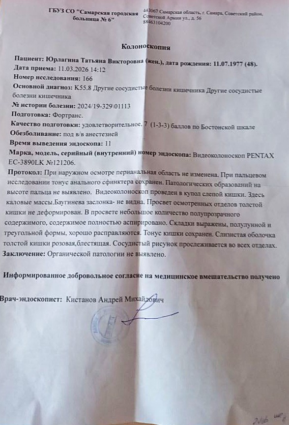 Добрый день, доктор! Ну вот наконец-то я сделала колоноскопию, пожалуйста, опишите мне мой диагноз и что там у меня? К гастроэнтерологу я еще не скоро попаду, потому что к нему очередь, а я человек небогатый для платных врачей, мои жалобы: могу не ходить в туалет по 3 дня, кал как горох. Сколько себя помню, я всю жизнь так живу: то слабительные пью, то клизмы делаю, потом начала считать калории, чтобы похудеть, и начались проблемы с выходом, по 3 дня хожу без туалета, заранее спасибо, если есть такая возможность, может посоветуете хорошего врача в Самаре.