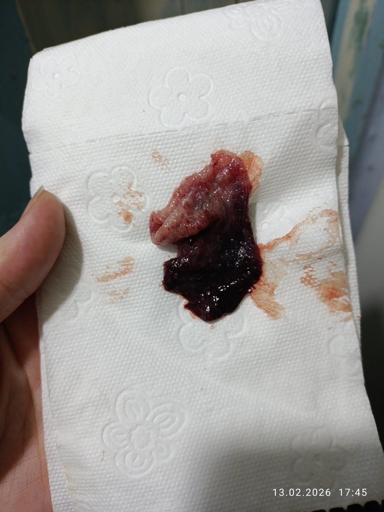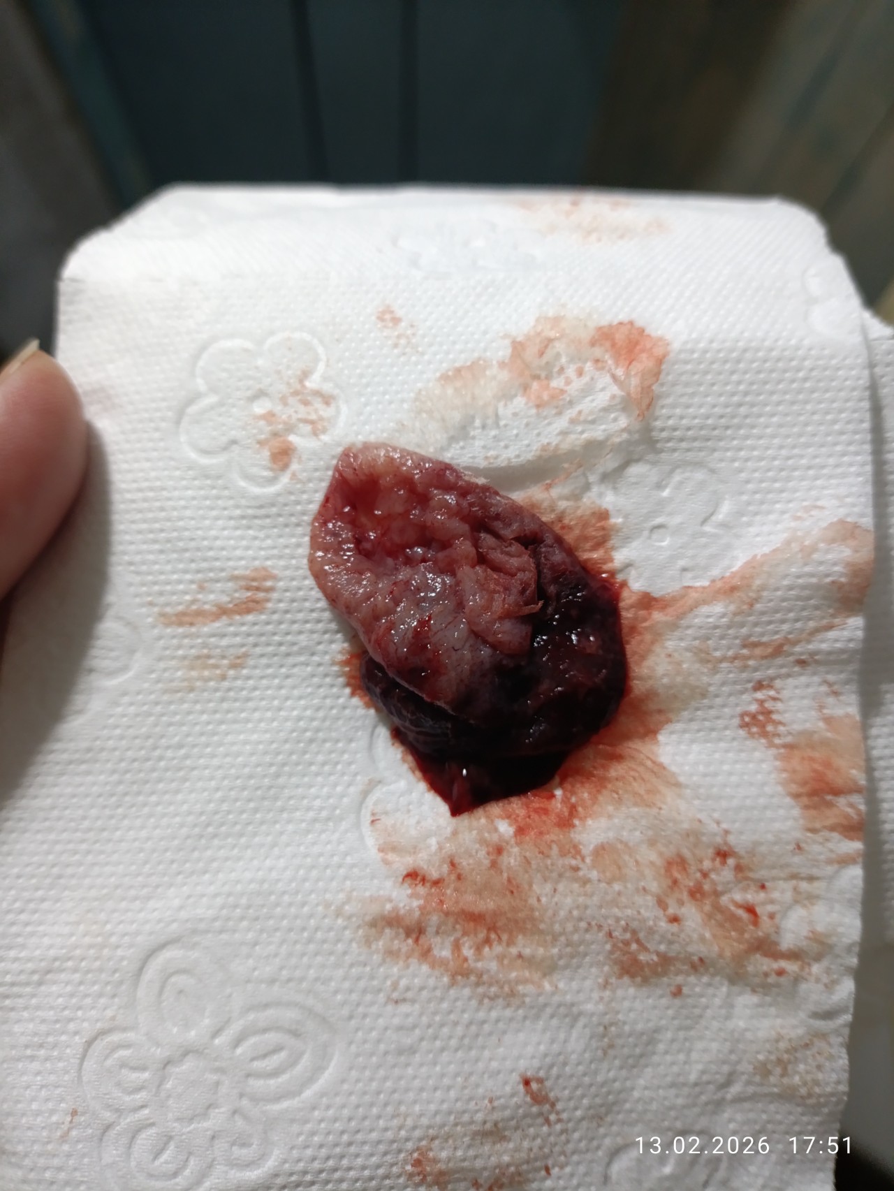 Здравствуйте, месячные идут 13 день. По УЗИ определили кисту в левом яичнике 4.1 мм, признаки гиперплазии эндометрия, признаки мультифолликулярных яичников. Сегодня под вечер заметила странные выделения, похожие на сгусток крови с кожей в виде мешочка. Врач гинеколог помочь не смогла, а записи до неё ждать долго. Помогите пожалуйста определить, что это. Если очень серьёзно, запишусь до платного.