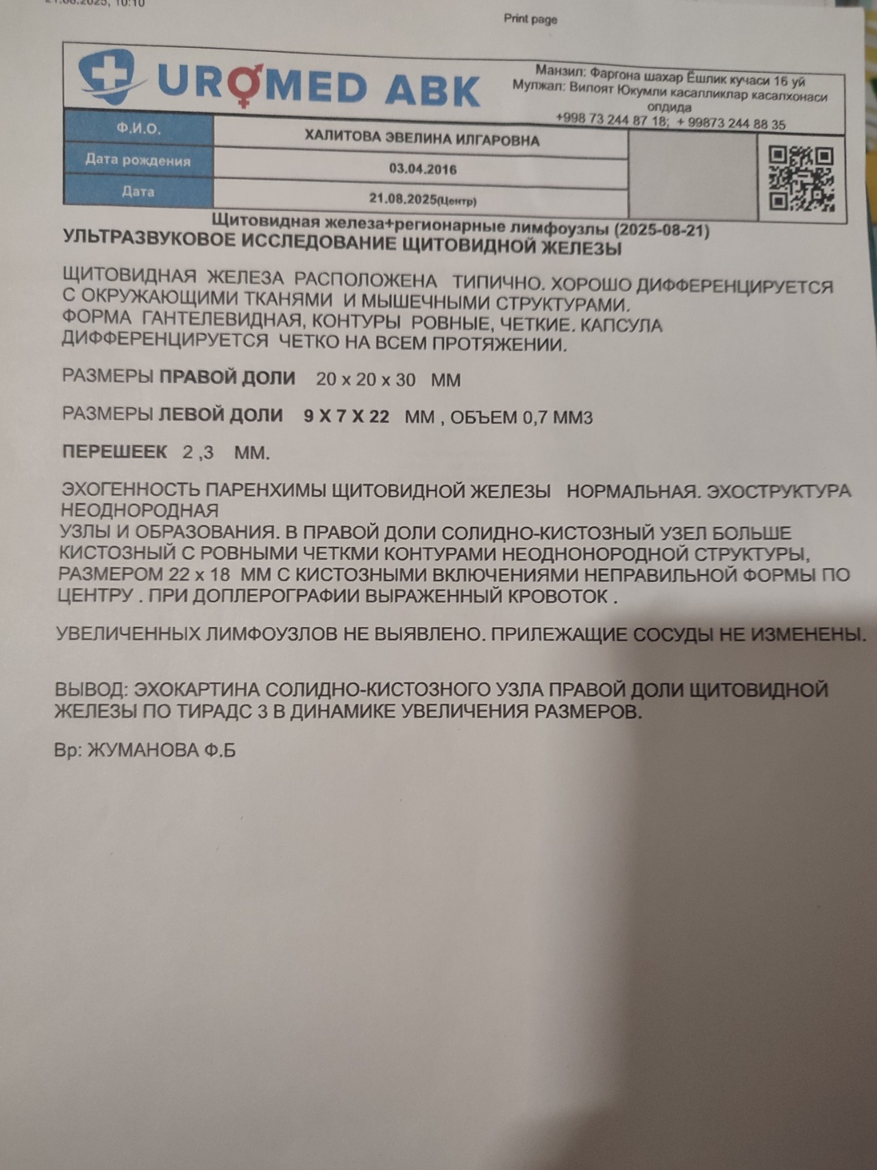 Здравствуйте, посоветуйте пожалуйста какае есть методы лечения "эхокартины солидно-кистозного узла правой доли щитовидной железы в динамике увеличения размеров 22×18мм" Ребенку 9 лет. 21.07.2025 года обнаружили шишку на шее ребенка, обратились Сразу к эндокринологу, назначили сдачу анализов на гармоны и УЗИ, на УЗИ сказали, что киста размером 17,5×18мм, через месяц повторное узи увеличение до 22×18мм Отправили к онкологу, но там говорят, что только нужно удалять операбельно