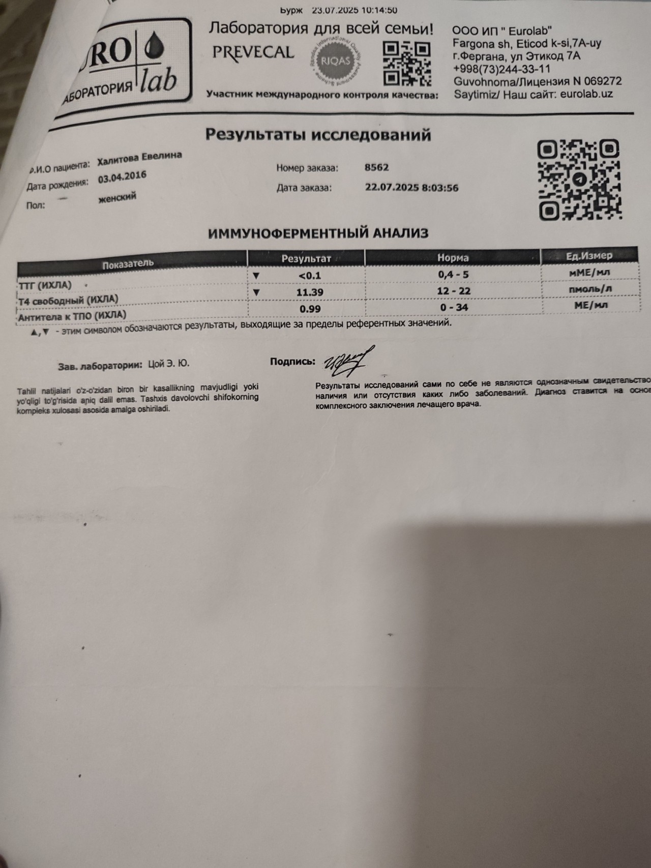 Узи щитовидной железы Моей дочери 6 лет вес 25кг рост 121см, за последний год ребенок...