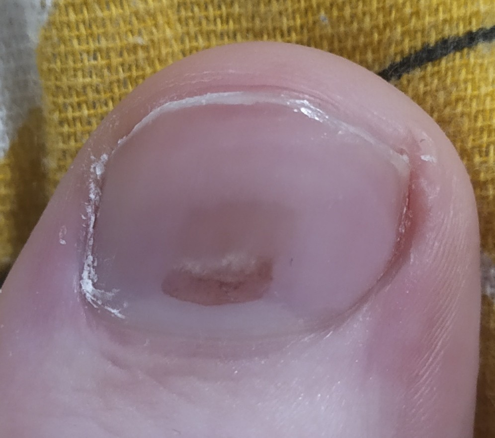 Здравствуйте! Пару недель назад у меня на ногте большого пальца ноги появилось какое то странное коричневое пятно. Оно вроде не болит, но очень боязно что оно не проходит. Каких либо травм не получала, и вот не понятно откуда оно появилось. Фото прилагаю. Помогите пожалуйста разобраться что это такое