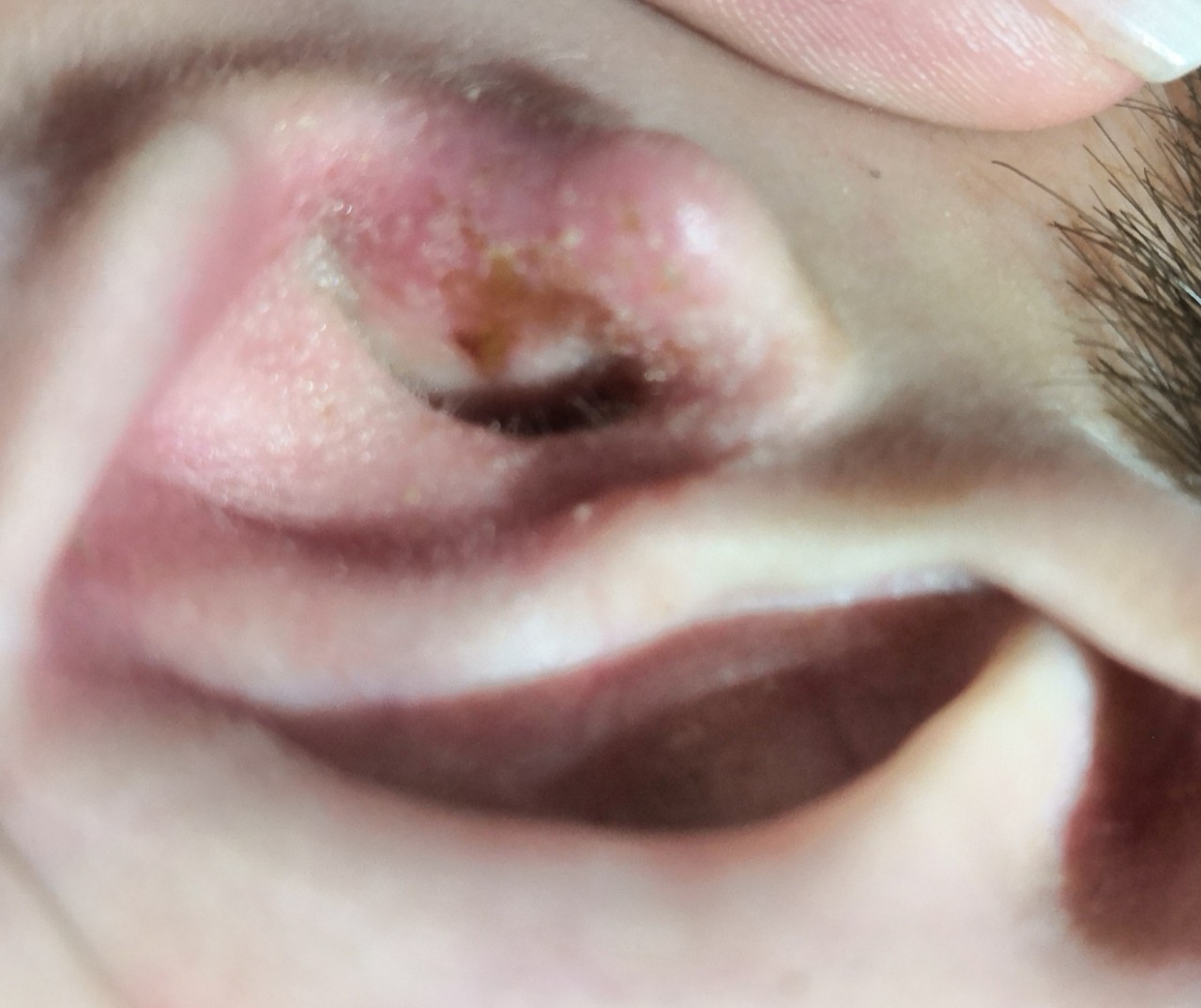 Здравствуйте, у ребенка несколько дней назад заболело ухо. При осмотре не было никаких болячек. Сейчас в ушной раковине болячка и все покрылось коркой, чешится и болит. Ночью буд то бы вилилась вода из ушной раковины. Она немного сузилась из за корочки.