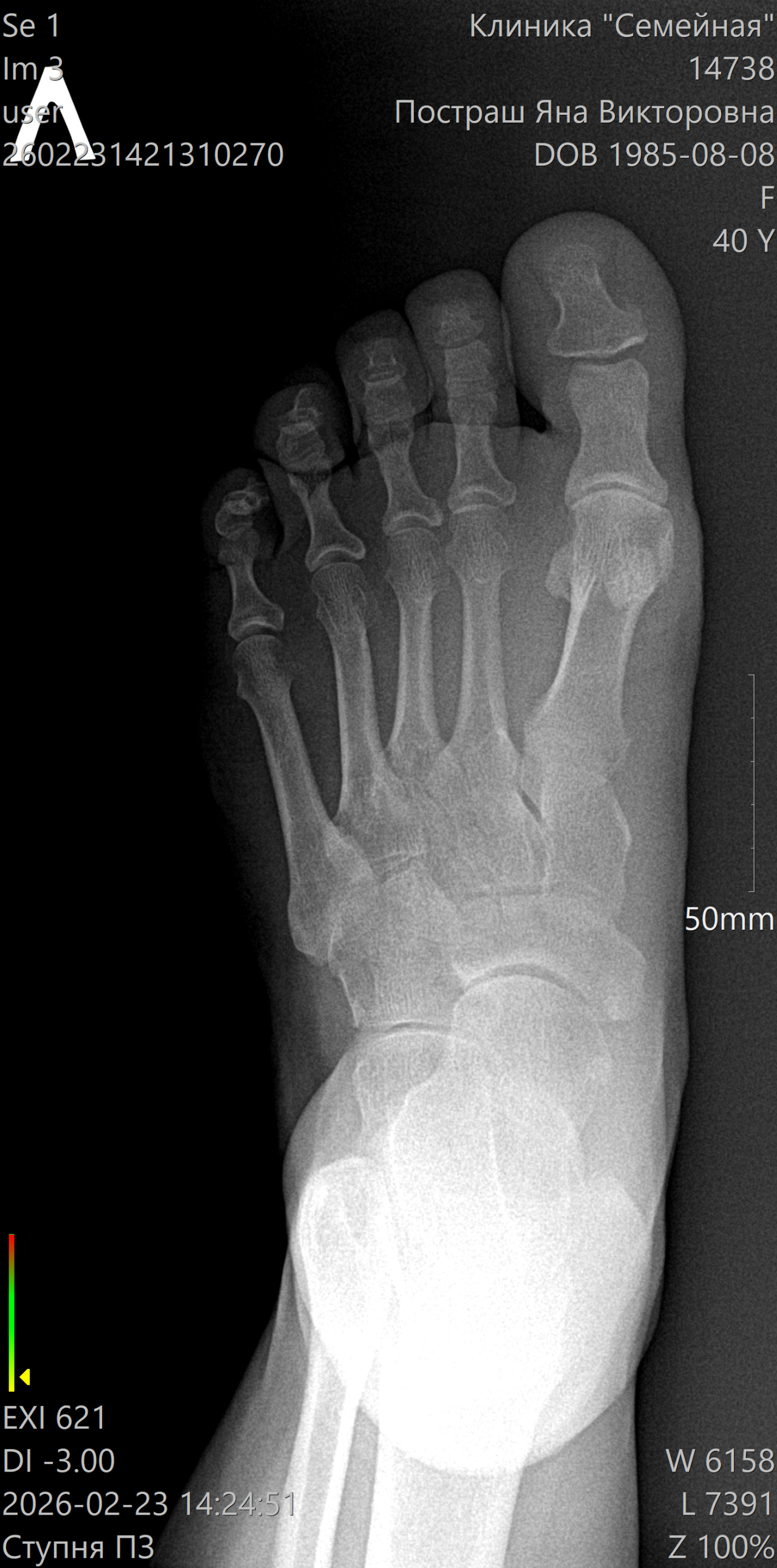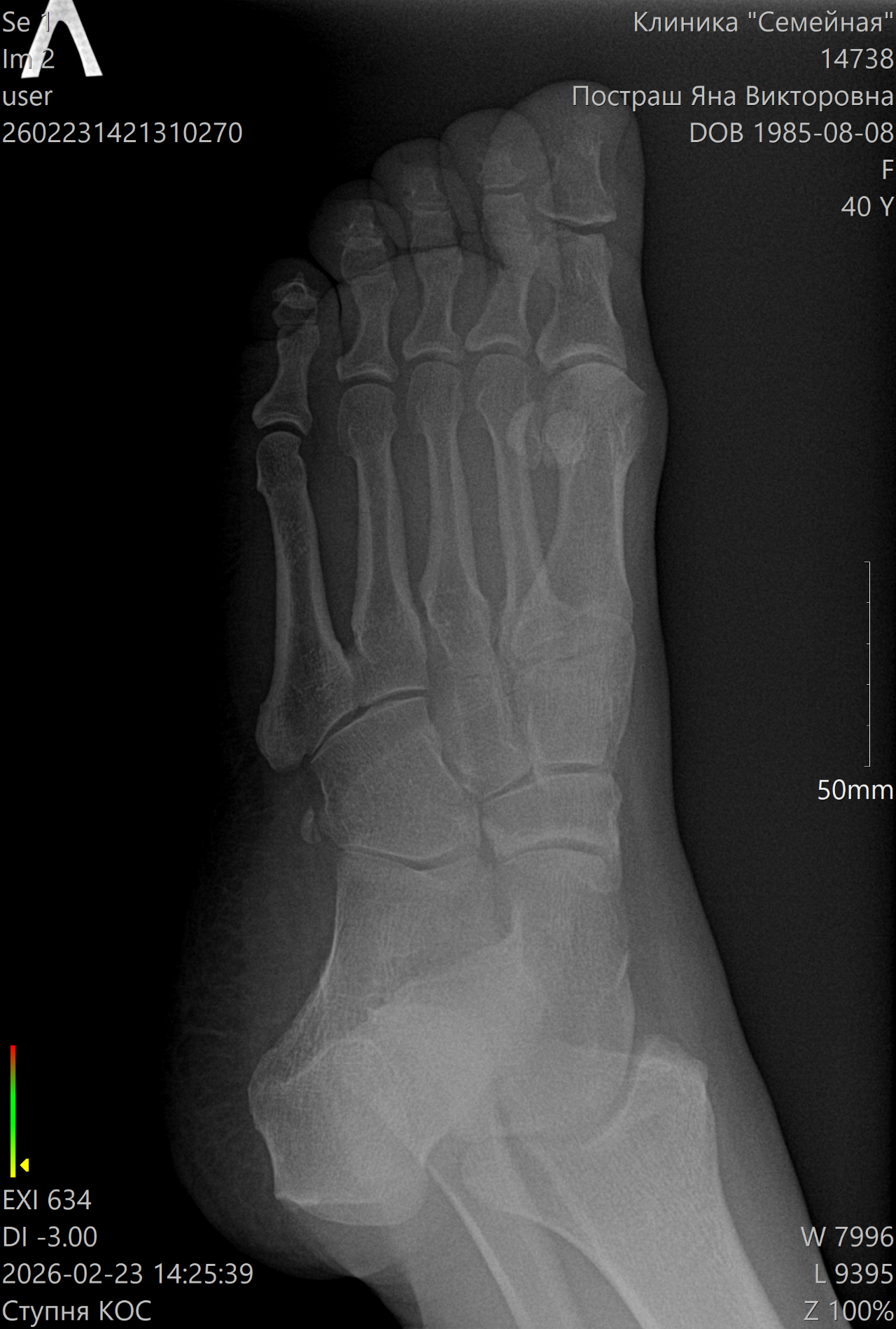 Несколько дней назад сильно ударила большой палец ноги. Поболело место ударно и все прошло бесследно. Спустя пару дней стала беспокоить боль в косточке при надавливании - сначала случайно задела, затем стала наблюдать. Боль не сильная, периодическая. Сделала рентген. К травматологу собираюсь на прием, но записи нет на ближайшее время. Внешне нога выглядит как обычно. Нет отека, синяка, подвижность не нарушена.