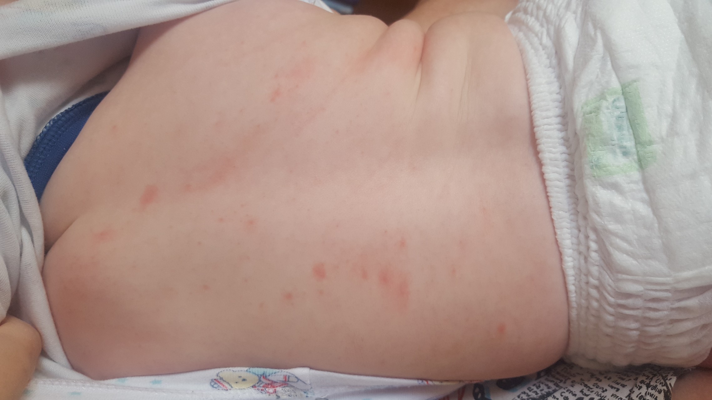 Здравствуйте, у ребенка 7 месяцев появилась сыпь на спине, уже неделю не проходит. Сначала думала, что реакция на гречку, но гречку не едим уже 5 дней, сыпь не проходит. Пятна есть побольше, есть прям совсем мелкие. Малыша это не беспокоит, ведет себя нормально. Около 10 дней назад заболел, кашль, насморк, приходила педиатр, сказала горло красное. Назначила виферон свечи и мирамистин в горло. И сказала не купать. Мы его неделю не купали и спину я его не видела, поэтому точный день когда появилось не знаю ( заметили в вс, 4 марта. Новых продуктов не ели, порошок правда другой. Но сыпь только на спине и немного на шее, с заходом на низ щечек, немного. Основное все на спине. Помогите, что это может быть?