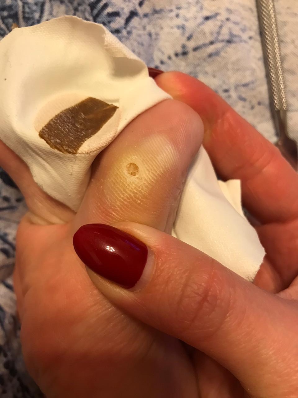 Здравствуйте, месяца два назад появилась мозоль на пальце ноги. Начал образовываться бугорок, после чего превратилось в стержневую мозоль. (как я думаю), было больно ходить и наступить вообще на палец. Наложила пластырь мозольный пластырь, типо солипод. Походила два дня и сняла, появилась дырочка, оттуда я достала кусочек кожи сухой, все обработала и заклеила обычным, в том месте продолжало болеть, думала это нормально, так как заживает. Но в итоге у меня ничего не прошло, дырочка зажила и все так же там бугорок и все так же у меня болит и не могу ходить. Подскажите, что мне делать дальше? Идти удалить лазером или вообще вырезать.