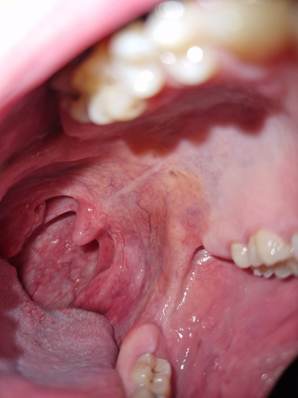Боли нет, дискомфорта практически не ощущаю. Кровоточивости не было. Язв или повреждений визуально не вижу. Глотание не нарушено, голос не изменился. Слух без изменений.