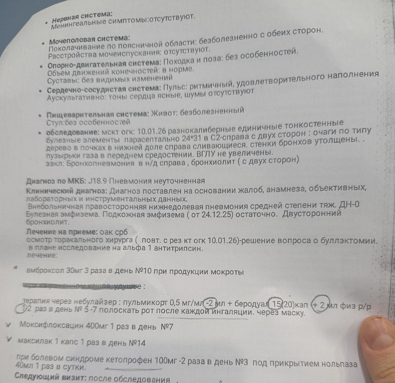 Здравствуйте, подскажите пожалуйста, сделали кт. Пневмония, буллы есть в лёгких, до этого была эмфизема шеи, лежал в больнице, сказали, что скорее всего булла какая-то лопнула. Хотелось бы узнать, что делать с этими буллами удалять или возможно просто наблюдение, к кому обращаться для решения, что с ними делать. И по пневмонии врачи при выписке говорили, что динамика положительная, можно выписать из больницы. Хотелось бы уточнить, а буллы могут исчезнуть в ходе лечения, если не хирургическим путем. Прикрепляю описание КТ и заключение пульмонолога на основании КТ и очного осмотра.
