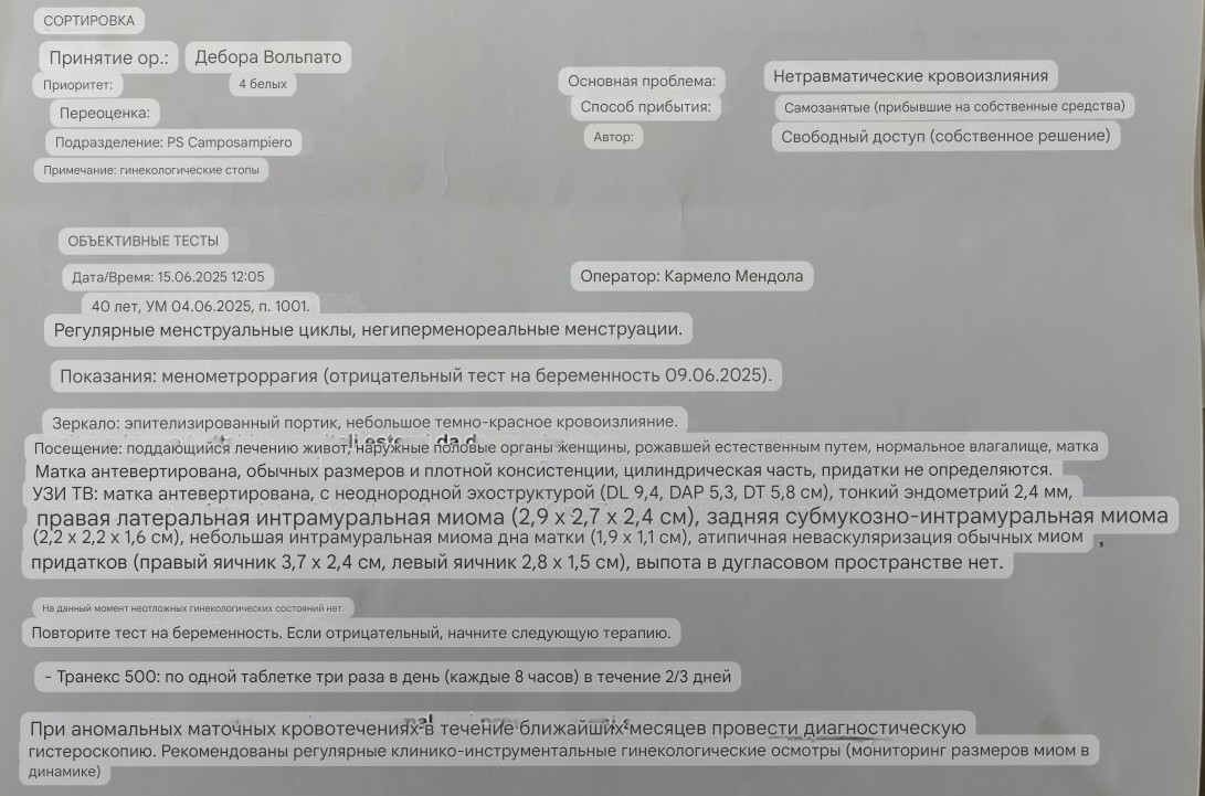 Добрый день, у меня стабильный цикл 25-26 дней, месячные идут 4-5 дней, были сбои в цикле (начинались на 14 день мц) в 2022 и 2023г., но сами восстанавливались. Месячные обильные второй день и несколько часов (прокладки на 4 к. хватает на 3 часа). ✅ У меня есть подслизистая миома (около 2 см), наблюдается уже 3 года, рост примерно 0.5 см в год. ✅ В этом цикле были двое менструальных кровотечений: первые (04.06-08.06) сразу после них была красная мазня, потом коричневая, мазня перешла во вторые, месячные, — на 14-й день цикла (похожие по характеру на обычные мои менструации). В конце 4го дня месячные практически закончились, но на 5й день утро появилась красная кровь на ежедневке. ✅ После вторых месячных кровянистые выделения появляются в основном при натуживании, кашле, физической нагрузке. ✅ УЗИ делала в скорой 15.06., я нахожусь в Италии, перевела через переводчик УЗИ. ✅ Врач выписал Транексам 500мг 3 раза в день, если мазня не прекратится, но мазня перешла в месячные, и я решила не принимать по а таблетки (так как подобная ситуация была в 2023г. и цикл восстановился сам). Вчера я начала прием Транексам в 19, потом в 3 часа ночи ✅ в 4 утра сегодня кровь "полилась" при походе в туалет и сразу остановилась). Сейчас есть красная мазня на ежедневной прокладке. Вопрос: 1. Мне стоит принимать транексам в той же дозировке? Или увеличить? 2. Или мне нужно сегодня обратится повторно в скорую? 3. Данная ситуация спровоцированная миомой? 4. Визит к гинекологу с повторным УЗИ запланирован на 3 июля