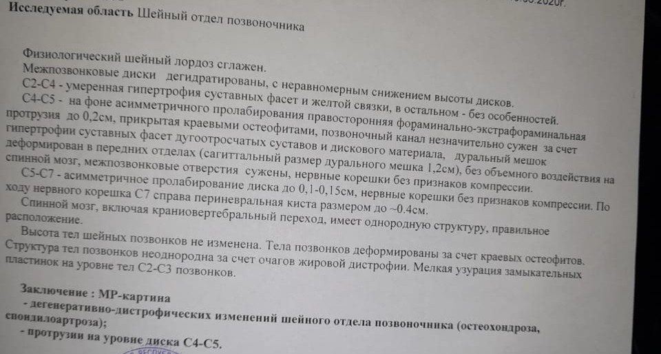 1 врач поставила диагноз: Цервикальная брахиалгия на фоне остеохондроза, Кралналгия. Другой врач: Мигрень. Приступы 2,3 раза в месяц с обеих сторон. Постоянная тяжёлая голова, шум в голове и снижение слуха. Лечение Мильгамма, мовалис, аркоксил, мексидол в/м. Пиксмилон, сермион, магнирот. Улучшение временное.