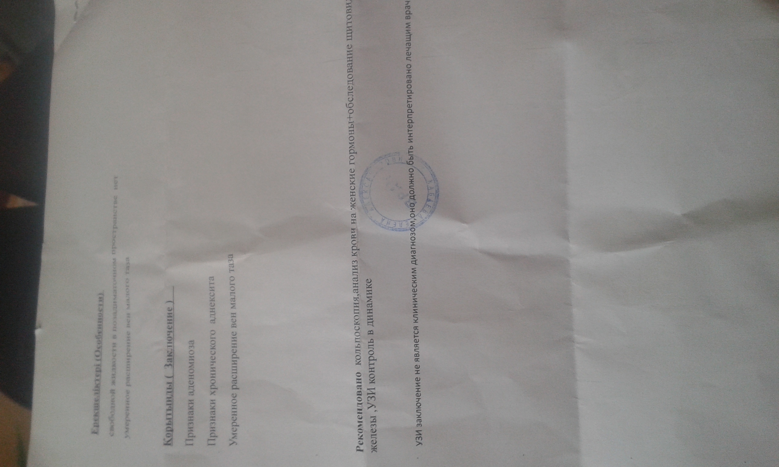 Признаки аденомиоза, хронический аденоксит, умеренное расширение вен малого таза