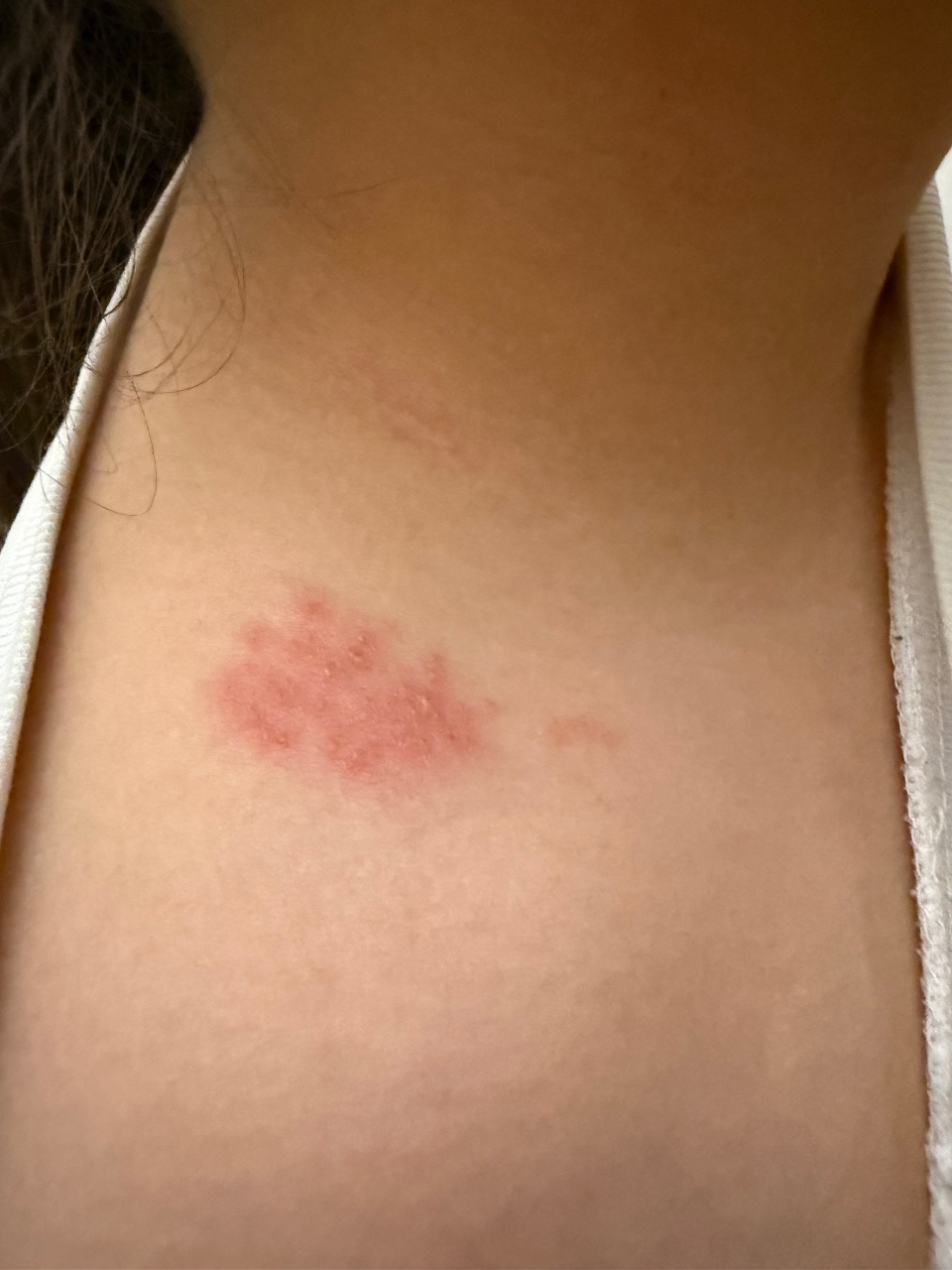 Здравствуйте, у дочери с ночи на утро появилось пятно, сыпь сбоку на шее. Сопровождается зудом. Отека нет. Мелкие прыщики, не мокнущие. Жалуется на боль.
