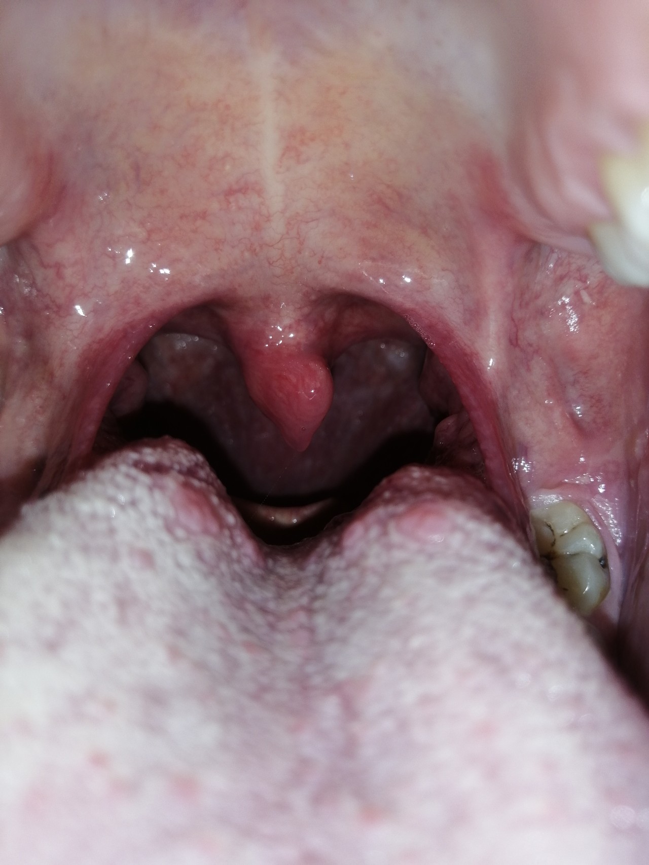 Здравствуйте. У меня такая проблема 7 месяцев назад бросил курить резко. Из за этого появились проблемы как с давлением так и бронхами, у меня выявили хобл и бронхиальную астму (прохожу лечение) . Но на протяжении всего времени замучила макрота из горла (как бы изнутри доставать приходится) а щас вообще язычок стак красным и горло покраснело(надрал наверно или? Не знаю). Горло не болит ощущения комка или инородного тела нет, иногда в ушах звенит. Кашля нет, макрота чистая без кровяных выделений Просто щас в командировке приеду сразу пойду к доктору, но я боюсь что что-то серьезное (по большей части из за макроты и покраснения язычка у меня такого ни когда не было) . Щас полоскаю горло фурацилином и рассасываю нео-ангин, если по фото что нибудь видно то скажите своё мнение пожалуйста.