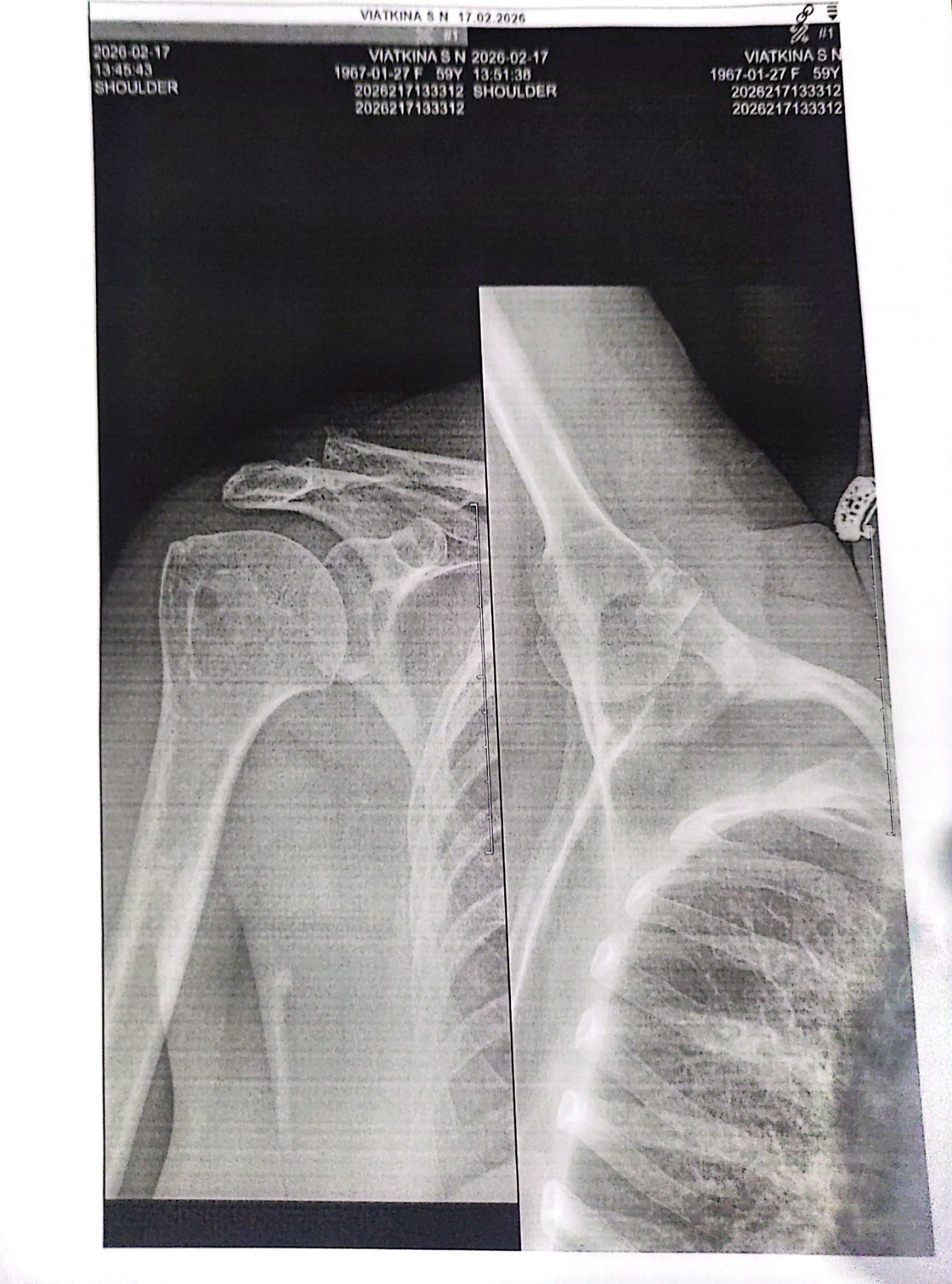 Здравствуйте, Упала на правую руку ударилась локтем, болит сильно, не могу поднять вверх и отвести назад. Отека, синяка, кровоподтёка нет. Сделала рентген плечевого сустава в 2 х проекциях можете расшифровать