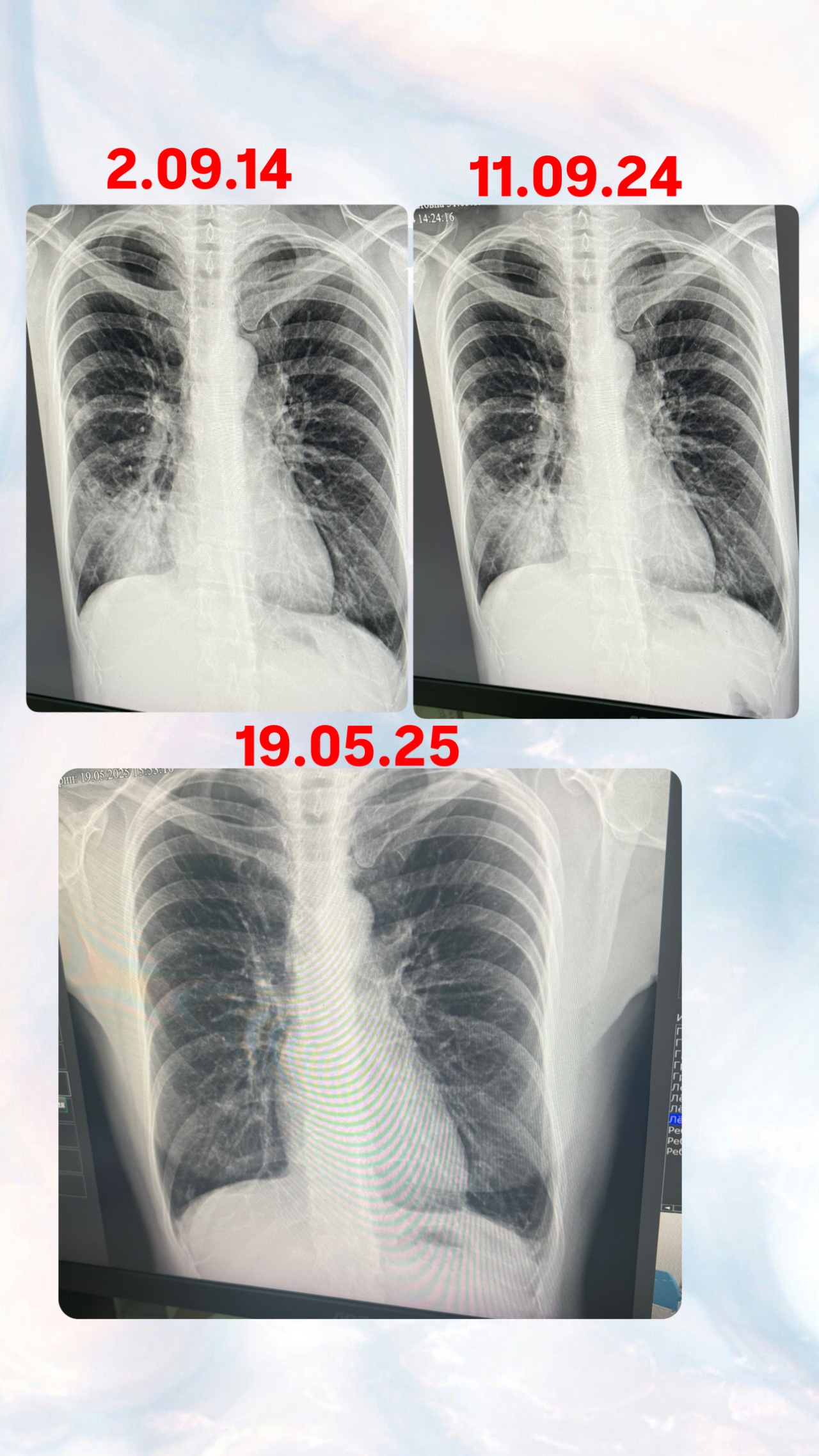 Доброго времени суток! В сентябре 2024 года я переболела пневмонии, температура долго держалась, лежала в больнице 2 недели, повторила рентген снимок в мае 2025 года, посмотрите пожалуйста и дайте свой комментарий, спасибо заранее ????????