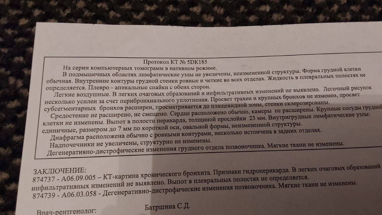 Бронхит на КТ можно перепутать с проявлениями сердечной недостаточности. Жидкость в перикарде выраженная, но что пишут на УЗИ сердца?