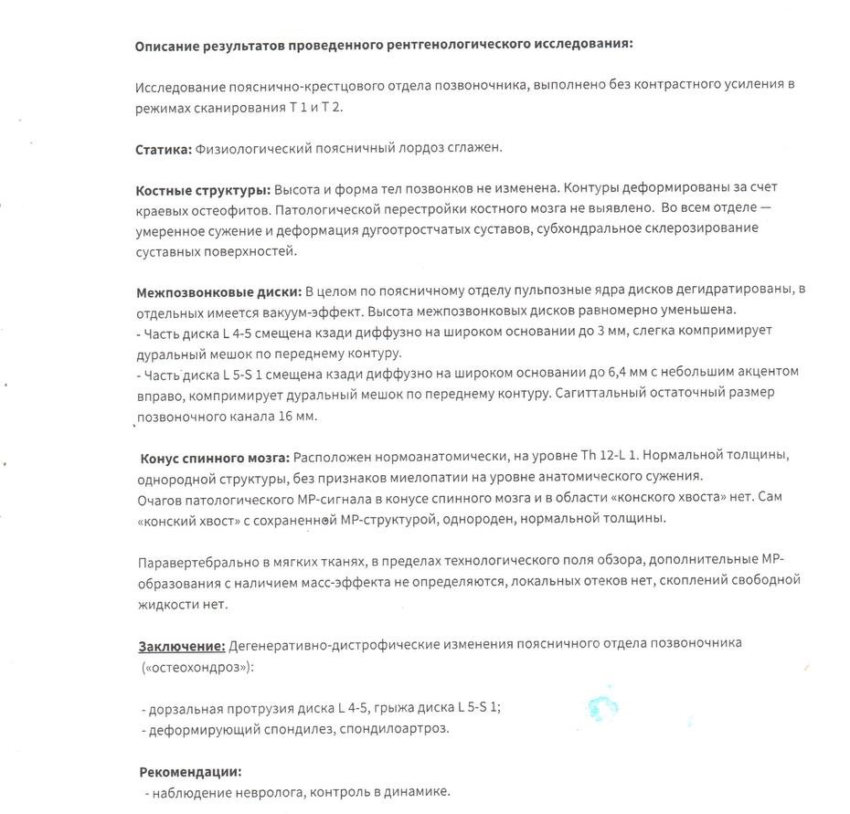 На МРТ обнаружена грыжа диска L5-S1 размером 6.4 мм, с акцентом вправо, компримирующая дуральный мешок.