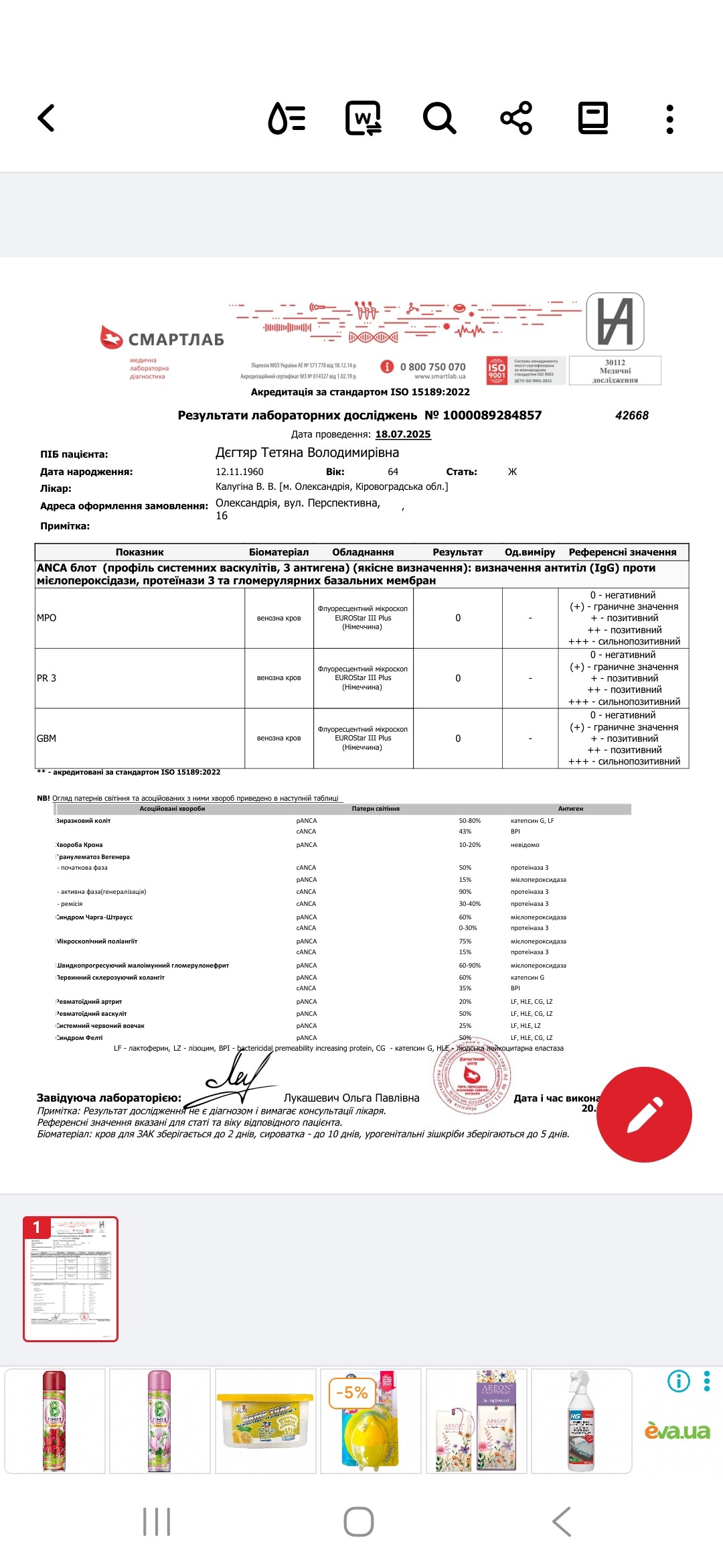 Доброго дня, підскажіть будь ласка, мамі 64р з'явилися висипи дерматолог відправив до ревматолога і ставлять діагноз системний васкуліт, гранулематоз вегенера. Чи можете порадити які ще здати аналізи щоб підтвердити чи спростувати цей діагноз?