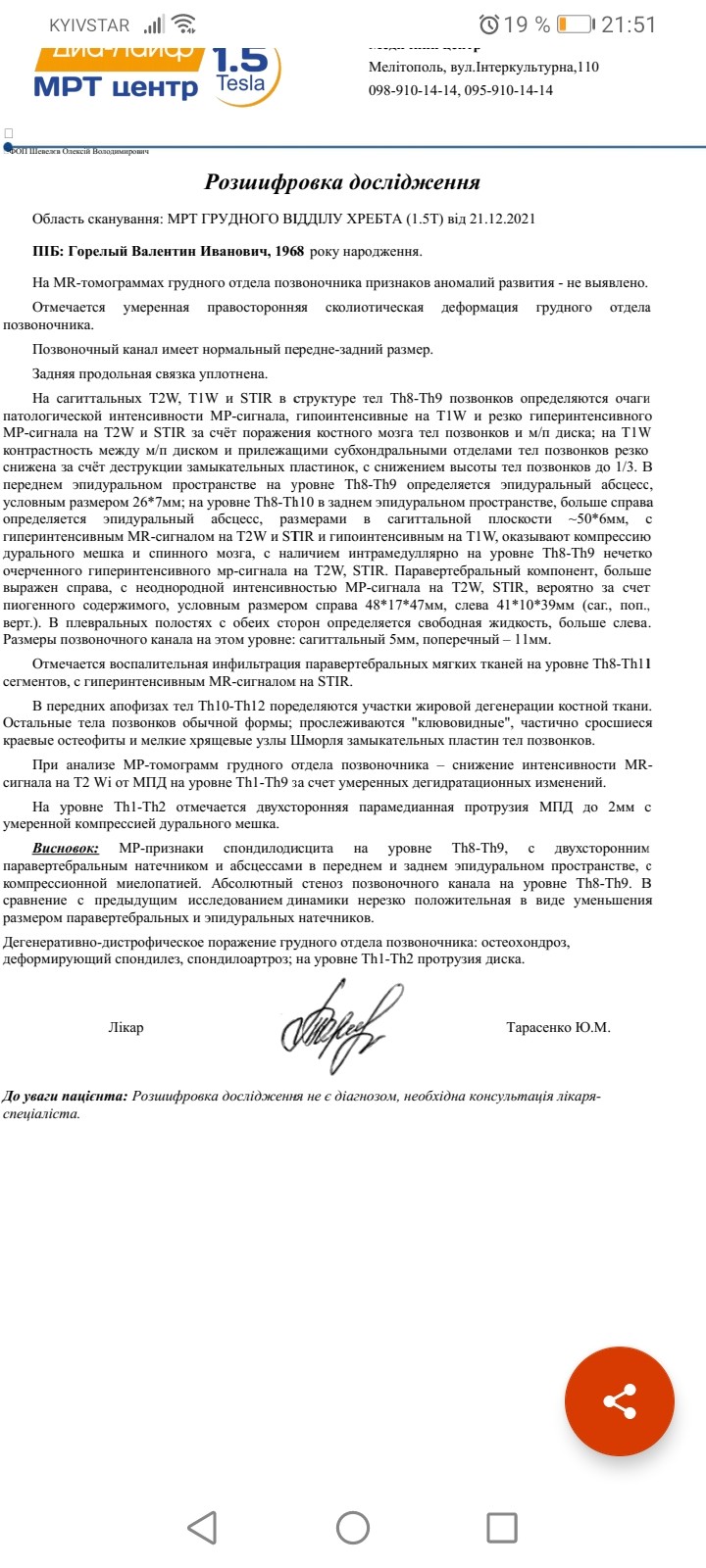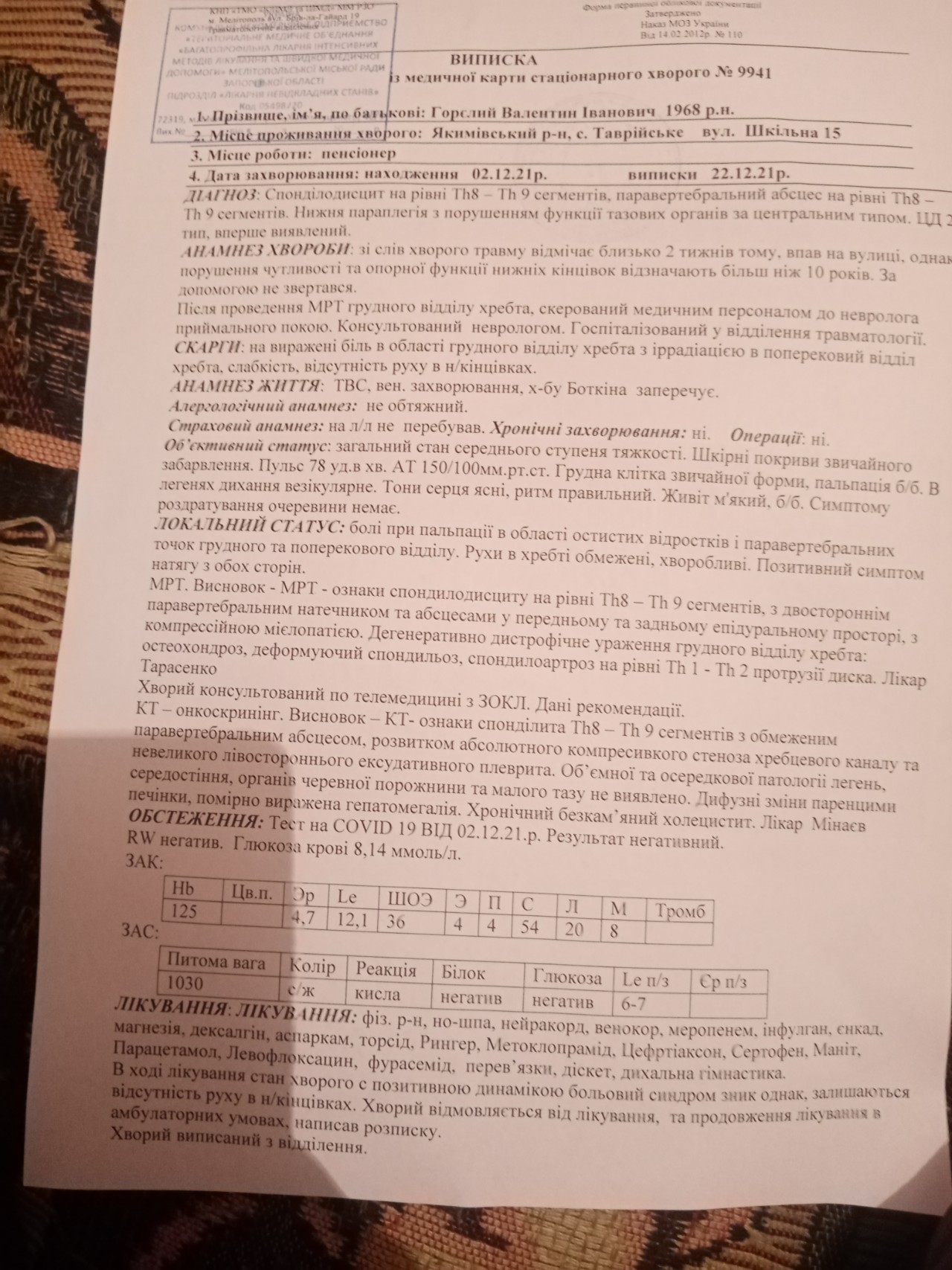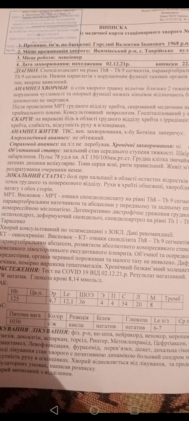 Здравствуйте, у отца диагноз спондилодисцит Th8 Th9, паравельтабельный абсецц на уровне Th8, Th9, нижняя параплегия, в больнице прокапали и отправили домой, подскажите что нам делать?