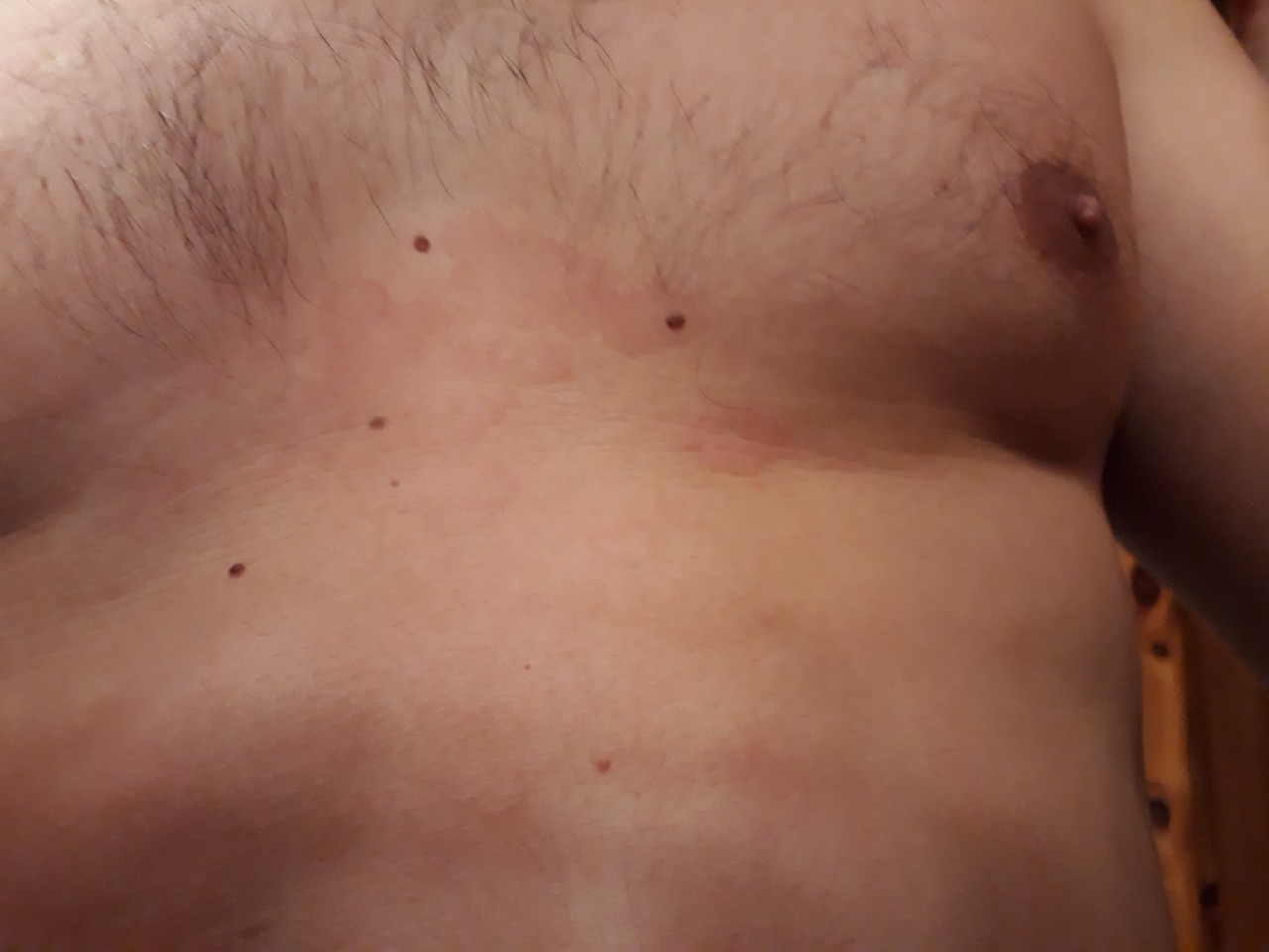 Пятна красного цвета на груди у мужчины У меня пятна по обоими грудями красного цвета...