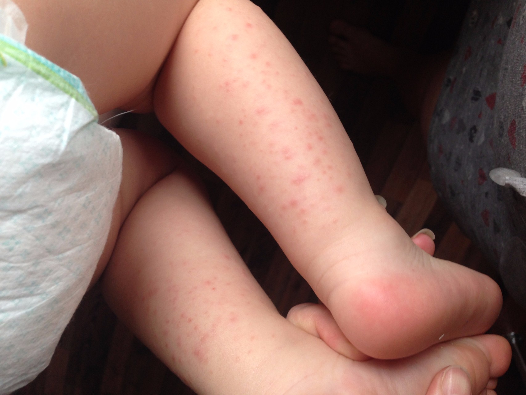 5 дней назад мы вышли с ребенком гулять, всё как обычно. По возвращении увидела на ножках и ручках странную сыпь. Сразу скажу, что никакую новую одежду мы не одевали и порошок не меняли.