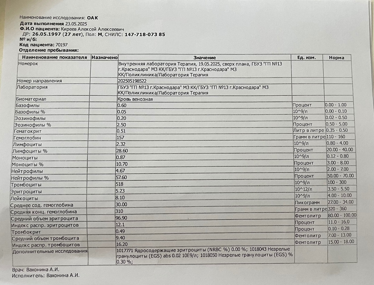 Повышены тромбоциты, лейкоциты, моноциты, соэ, незрелые гранулоцит Александр Борисович....