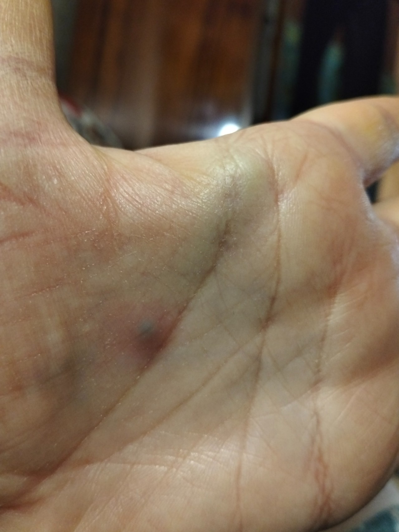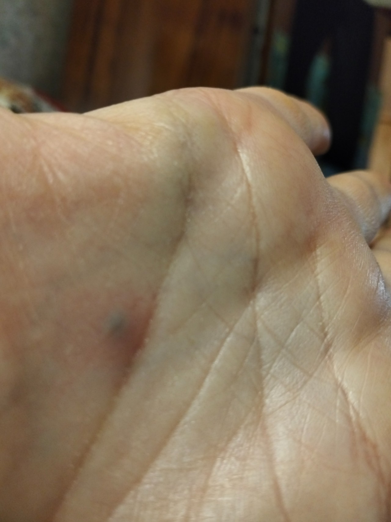 Здравствуйте, неделю назад на ладони появилась небольшая плотная шишка, внутри синеватая, вокруг небольшое покраснение. При надавливании болит и чувствуется небольшой неприятный зуд. Что это может быть?