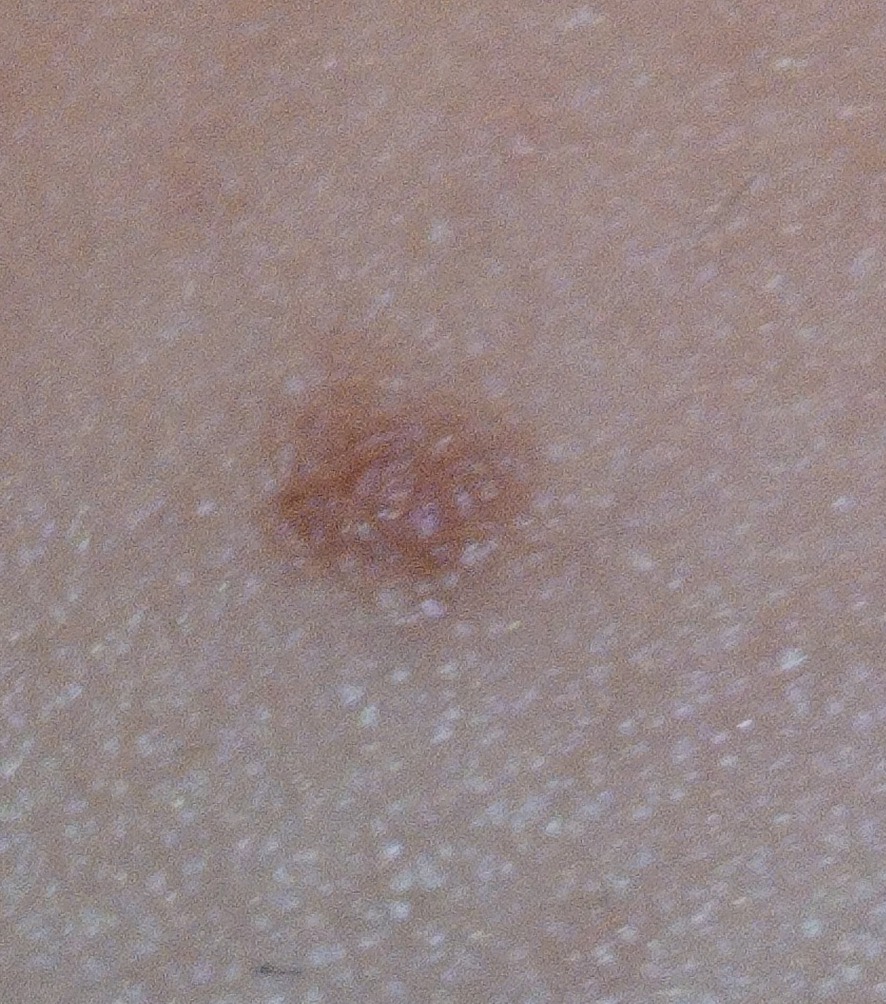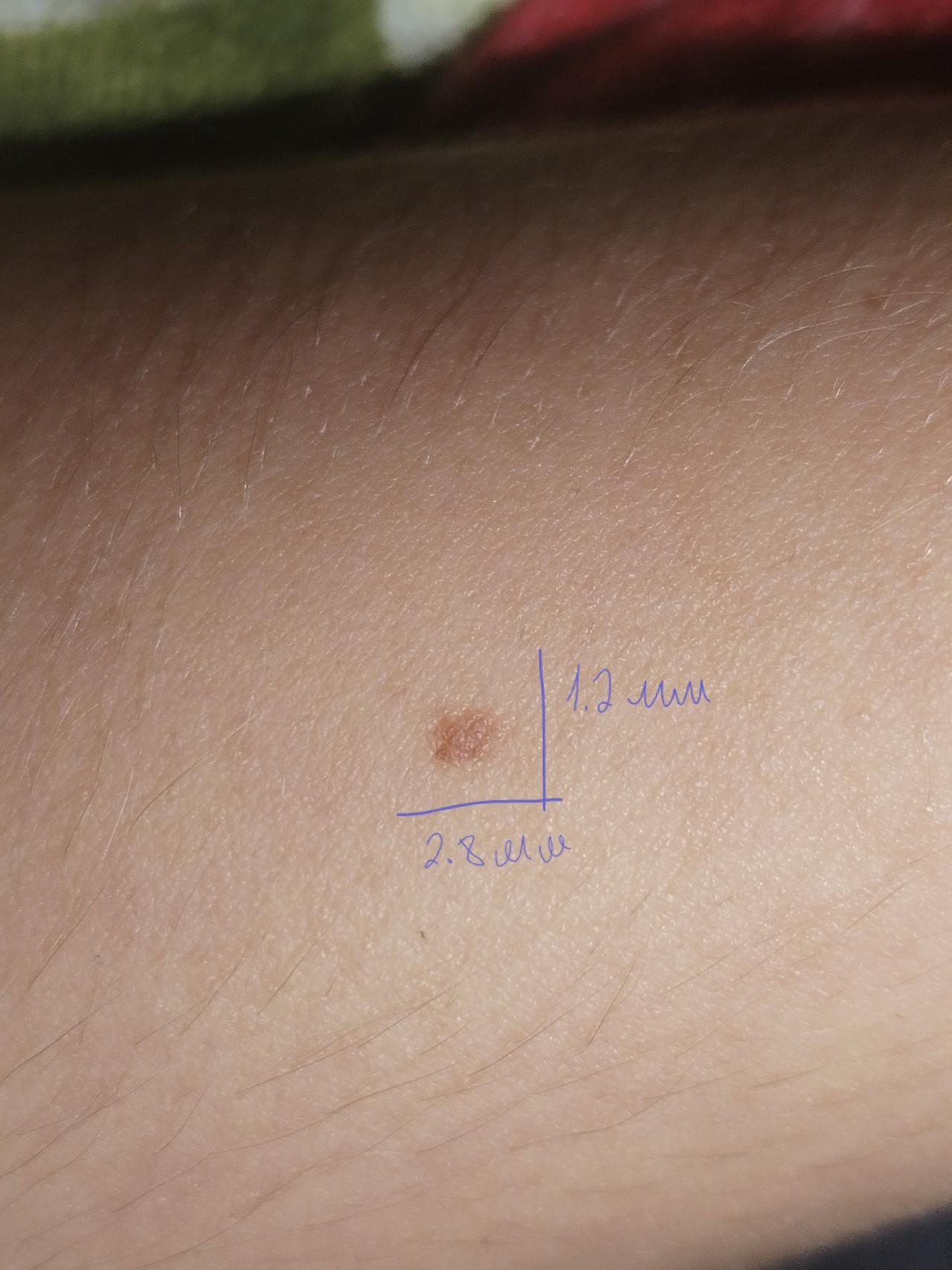 Здравствуйте, спасибо за ответ! Но можете ещё глянуть на вот этот экземпляр? Появился 4 месяца назад, не изменился с того времени, была у 2 дерматологов которые смотрели на неё под дерматоскопом сказали всё хорошо собачка родинка, но смущает форма и цвет, форма полумесяц, цвет светло коричневый но с разными оттенками коричневого внутри и 2 темные точки, врачи смотрели 19 и 8 лет стажа в двух независимых клиниках, сказали что все однозначно хорошо