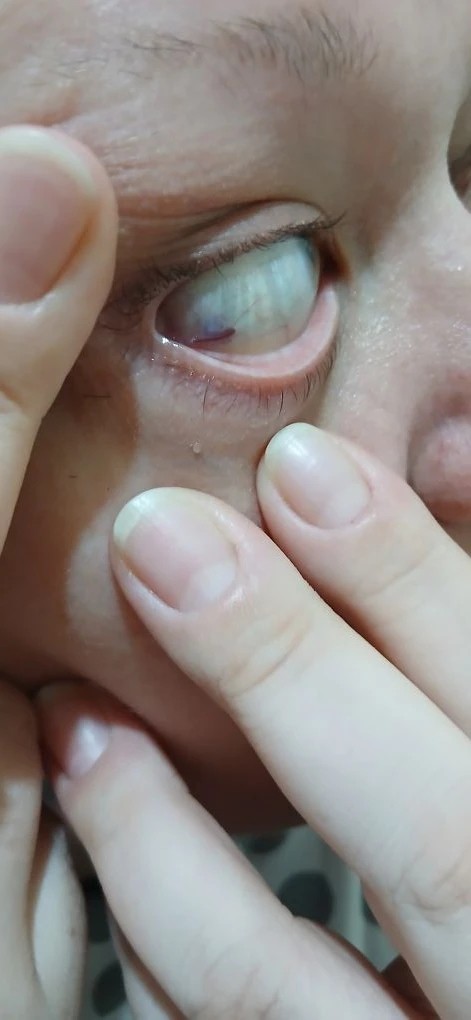 Здравствуйте, подскажите пожалуйста, что это может быть? Пару недель назад ребенок ткнул пальцем в глаз, было небольшое покраснение (точка) и от нее мелкие красные сосудики, около радужки, но спустя неделю эта сетка прошла, но осталось вот такое пятно и как будто надутый сосуд, и синее пятно, при движении глаза есть болевые ощущения.