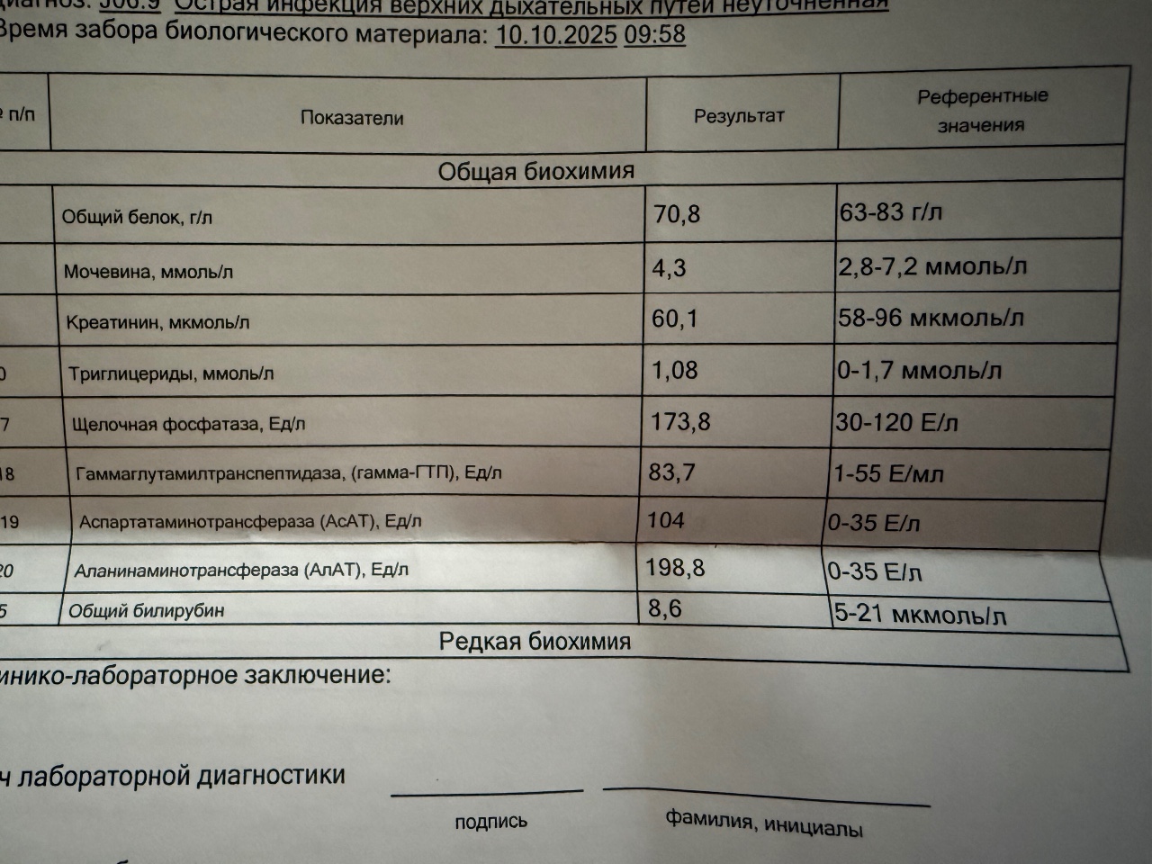 Здравствуйте, уже неделю держится температура от 37 до 38, слабость, головная боль. По анализам высокие следующие показатели: щелочная фосфатаза 173,8, гамма-ГТП 83,7, асат-104, алат-198,8. Фото прикладываю. Также были проведены экспресс тесты на гепатиты в и с- отрицательно. По узи ОБП все в норме, кроме обнаруженной кисты в печени 10мм. Скажите, пожалуйста, в чем может быть причина такого состояния и показателей, насколько это опасно? Заранее спасибо!
