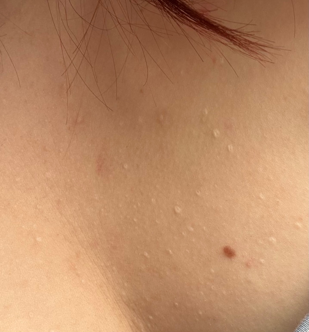 Здравствуйте, уже много лет есть высыпания(?) белого цвета, похожи больше на родинки, немного выпуклые и с точкой внутри. Сейчас их стало немного больше, однако уже имеющиеся в размере не меняются. Ни чешутся, ни шелушатся, ни воспаляются. Есть в зоне декольте, на плечах и пояснице. Это точно не шрамы и не постакне. На что это вообще похоже и стоит ли переживать?